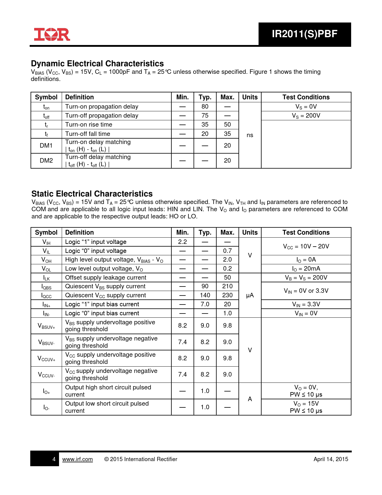 IR2011(S)PBF. Dynamic Electrical Characteristics. Symbol. Definition. Min. Typ. Max. Units. Test Conditions