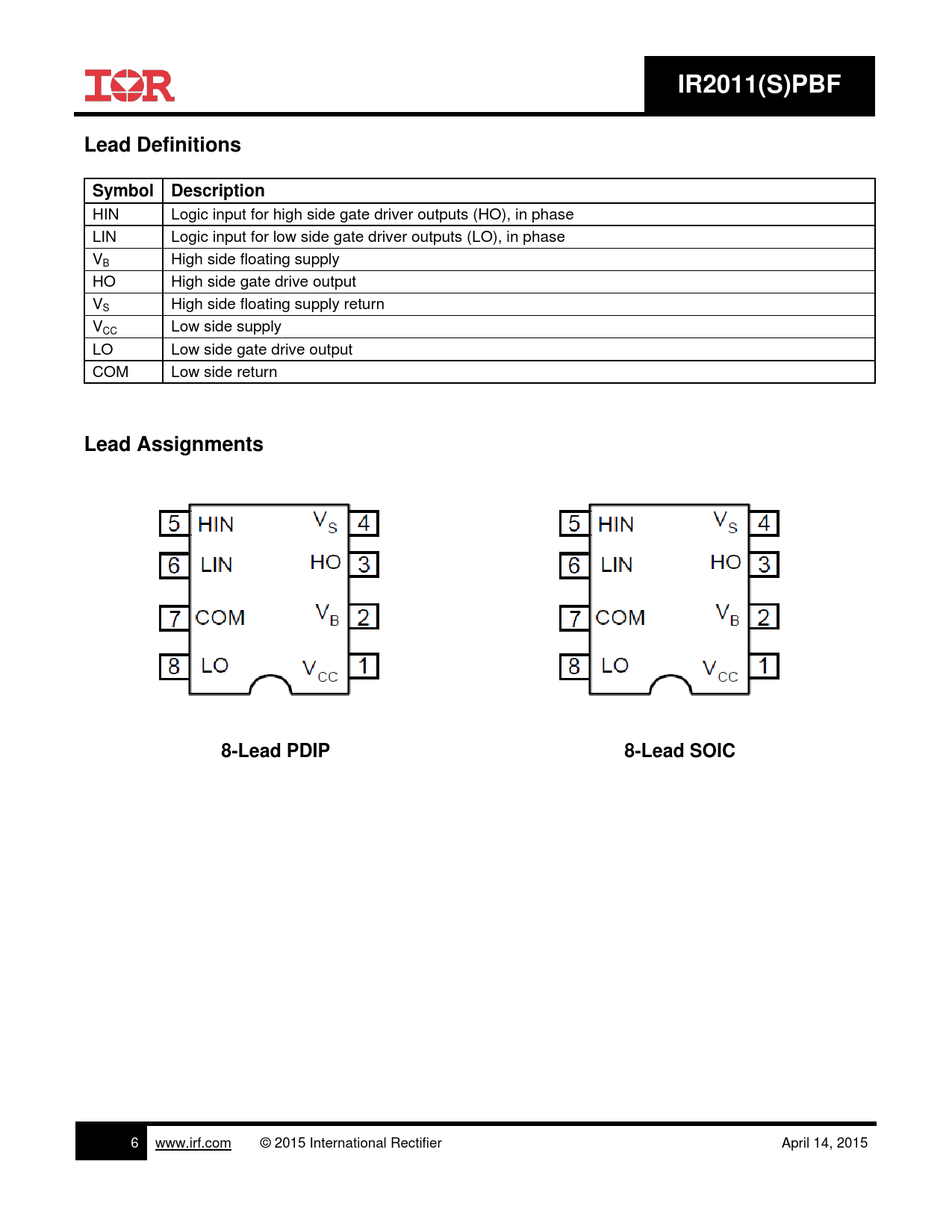 IR2011(S)PBF. Lead Definitions. Symbol. Description. Lead Assignments. 8-Lead PDIP. 8-Lead SOIC