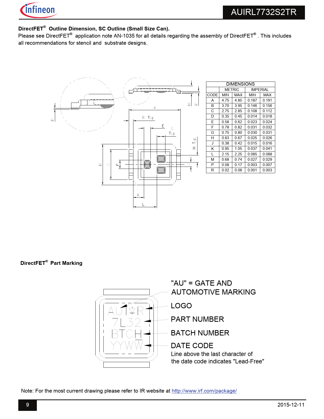 "AU" = GATE AND AUTOMOTIVE MARKING LOGO PART NUMBER BATCH NUMBER DATE CODE Line above the last character of the date code indicates "Lead-Free" Note: For the most current drawing please refer to IR website at http://www.irf.com/package/ 9 2015-12-11