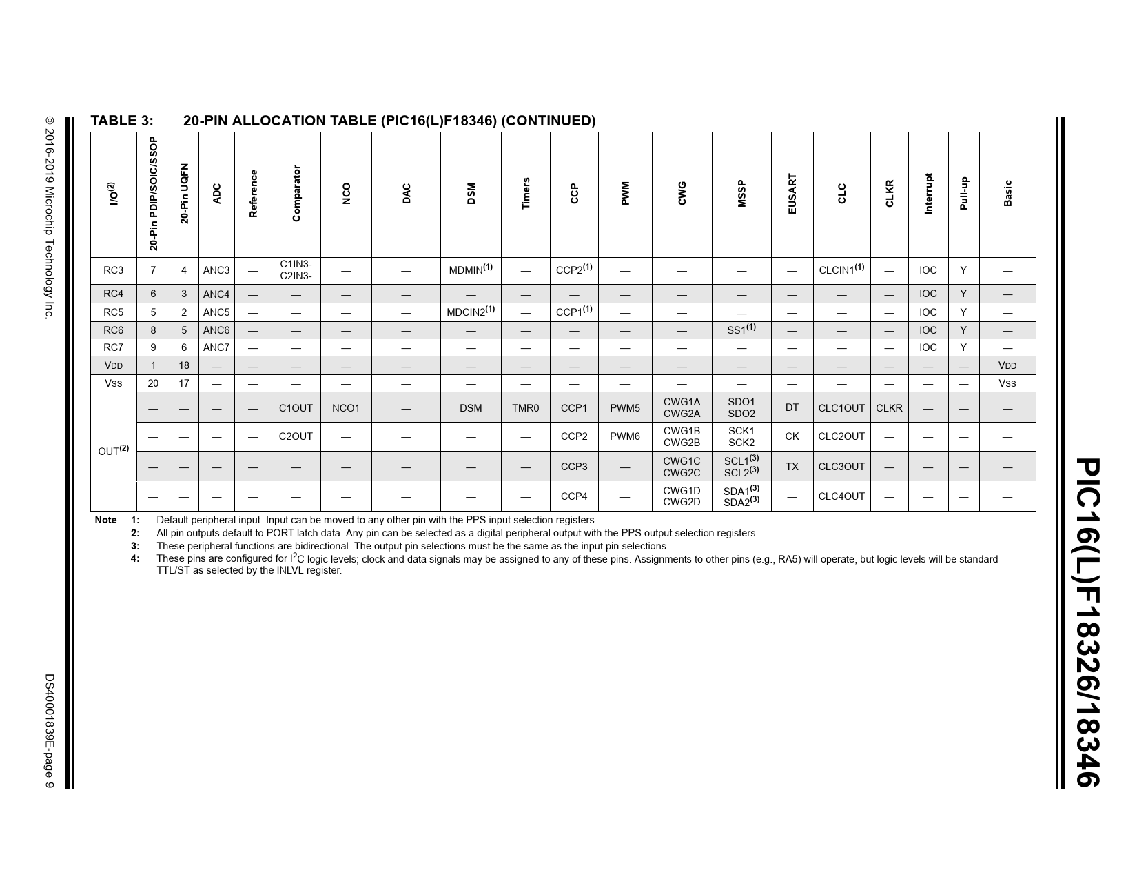 | Páginas / Página | 500 / 9 — TABLE 3:. 20-PIN ALLOCATION TABLE (PIC16(L)F18346) (CONTINUED). OP SS C/. … |