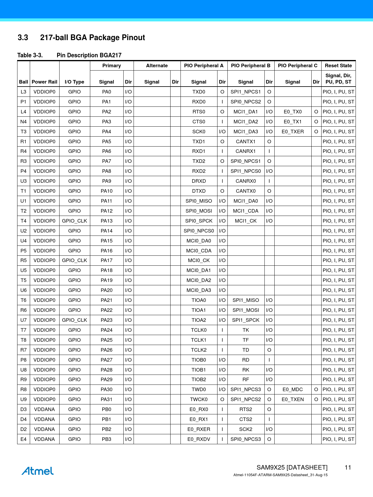 3.3 217-ball BGA Package Pinout Table 3-3. Pin Description BGA217 Primary Alternate PIO Peripheral A PIO Peripheral B PIO Peripheral C Reset State Signal, Dir, Ball Power Rail I/O Type Signal Dir Signal Dir Signal Dir Signal Dir Signal Dir PU, PD, ST