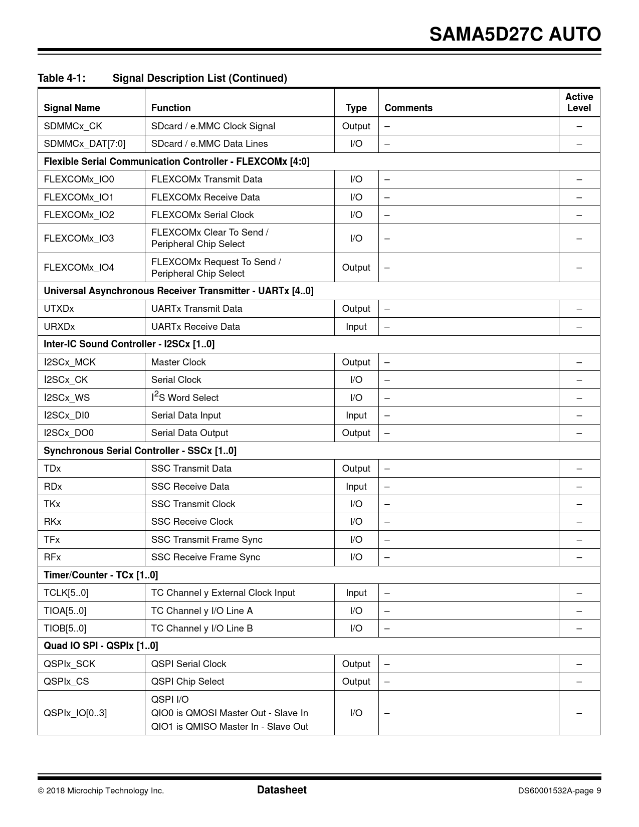 SAMA5D27C AUTO. Table 4-1:. Signal Description List (Continued). Active. Signal Name. Function. Type. Comments. Level