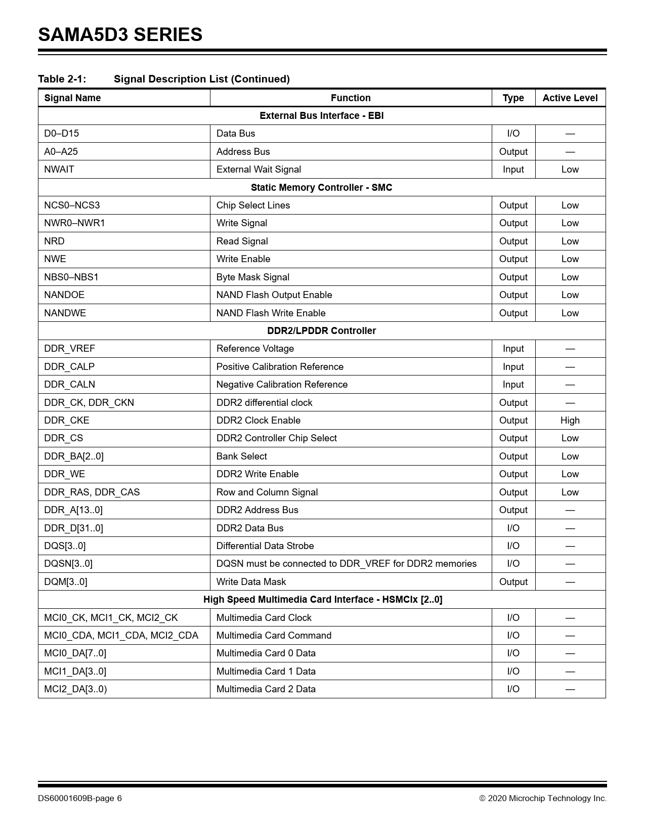SAMA5D3 SERIES Table 2-1: Signal Description List (Continued) Signal Name Function Type Active Level External Bus Interface - EBI