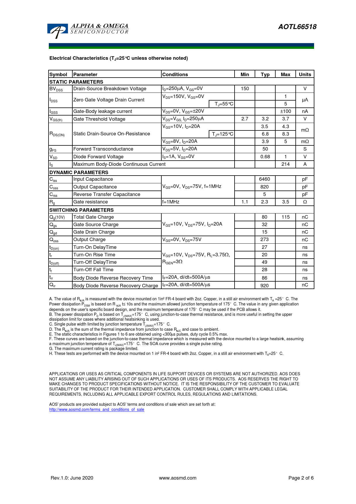 AOTL66518Electrical Characteristics (TJ=25°C unless otherwise noted)SymbolParameterConditionsMinTypMaxUnitsSTATIC PARAMETERS BVDSS Drain-Source Breakdown Voltage ID=250mA, VGS=0V 150 V VDS=150V, VGS=0V 1 I μA DSS Zero Gate Voltage Drain Current TJ=55°C 5 I Gate-Body leakage current V GSS DS=0V, VGS=±20V ±100 nA VGS(th) Gate Threshold Voltage VDS=VGS, ID=250mA 2.7 3.2 3.7 V VGS=10V, ID=20A 3.5 4.3 mΩ RDS(ON) Static Drain-Source On-Resistance TJ=125°C 6.8 8.3 VGS=8V, ID=20A 3.9 5 mΩ g Forward Transconductance V FS DS=5V, ID=20A 50 S V Diode Forward Voltage I SD S=1A, VGS=0V 0.68 1 V IS Maximum Body-Diode Continuous Current 214 A DYNAMIC PARAMETERS Ciss Input Capacitance 6460 pF C Output Capacitance V oss GS=0V, VDS=75V, f=1MHz 820 pF Crss Reverse Transfer Capacitance 5 pF Rg Gate resistance f=1MHz 1.1 2.3 3.5 Ω SWITCHING PARAMETERS Qg(10V) Total Gate Charge 80 115 nC Q V gs Gate Source Charge GS=10V, VDS=75V, ID=20A 32 nC Qgd Gate Drain Charge 15 nC Qoss Output Charge VGS=0V, VDS=75V 273 nC tD(on) Turn-On DelayTime 27 ns tr Turn-On Rise Time VGS=10V, VDS=75V, RL=3.75W, 20 ns t R D(off) Turn-Off DelayTime GEN=3W 49 ns tf Turn-Off Fall Time 28 ns trr Body Diode Reverse Recovery Time IF=20A, di/dt=500A/ms 86 ns Qrr Body Diode Reverse Recovery Charge IF=20A, di/dt=500A/ms 920 nC A. The value of Rq is measured with the device mounted on 1in2 FR-4 board with 2oz. Copper, in a still air environment with T =25°C. The JA A Power dissipation P is based on R t≤ 10s and the maximum allowed junction temperature of 175°C. The value in any given application DSM qJA depends on the user's specific board design, and the maximum temperature of 175°C may be used if the PCB allows it. B. The power dissipation P is based on T =175°C, using junction-to-case thermal resistance, and is more useful in setting the upper D J(MAX) dissipation limit for cases where additional heatsinking is used. C. Single pulse width limited by junction temperature T =175°C. J(MAX) D. The Rq is the sum of the thermal impedance from junction to case R and case to ambient. JA qJC E. The static characteristics in Figures 1 to 6 are obtained using <300ms pulses, duty cycle 0.5% max. F. These curves are based on the junction-to-case thermal impedance which is measured with the device mounted to a large heatsink, assuming a maximum junction temperature of T =175°C. The SOA curve provides a single pulse rating. J(MAX) G. The maximum current rating is package limited. H. These tests are performed with the device mounted on 1 in2 FR-4 board with 2oz. Copper, in a still air environment with T =25°C. A APPLICATIONS OR USES AS CRITICAL COMPONENTS IN LIFE SUPPORT DEVICES OR SYSTEMS ARE NOT AUTHORIZED. AOS DOES NOT ASSUME ANY LIABILITY ARISING OUT OF SUCH APPLICATIONS OR USES OF ITS PRODUCTS. AOS RESERVES THE RIGHT TO MAKE CHANGES TO PRODUCT SPECIFICATIONS WITHOUT NOTICE. IT IS THE RESPONSIBILITY OF THE CUSTOMER TO EVALUATE SUITABILITY OF THE PRODUCT FOR THEIR INTENDED APPLICATION. CUSTOMER SHALL COMPLY WITH APPLICABLE LEGAL REQUIREMENTS, INCLUDING ALL APPLICABLE EXPORT CONTROL RULES, REGULATIONS AND LIMITATIONS. AOS' products are provided subject to AOS' terms and conditions of sale which are set forth at: http://www.aosmd.com/terms_and_conditions_of_sale Rev.1.0: June 2020 www.aosmd.com Page 2 of 6