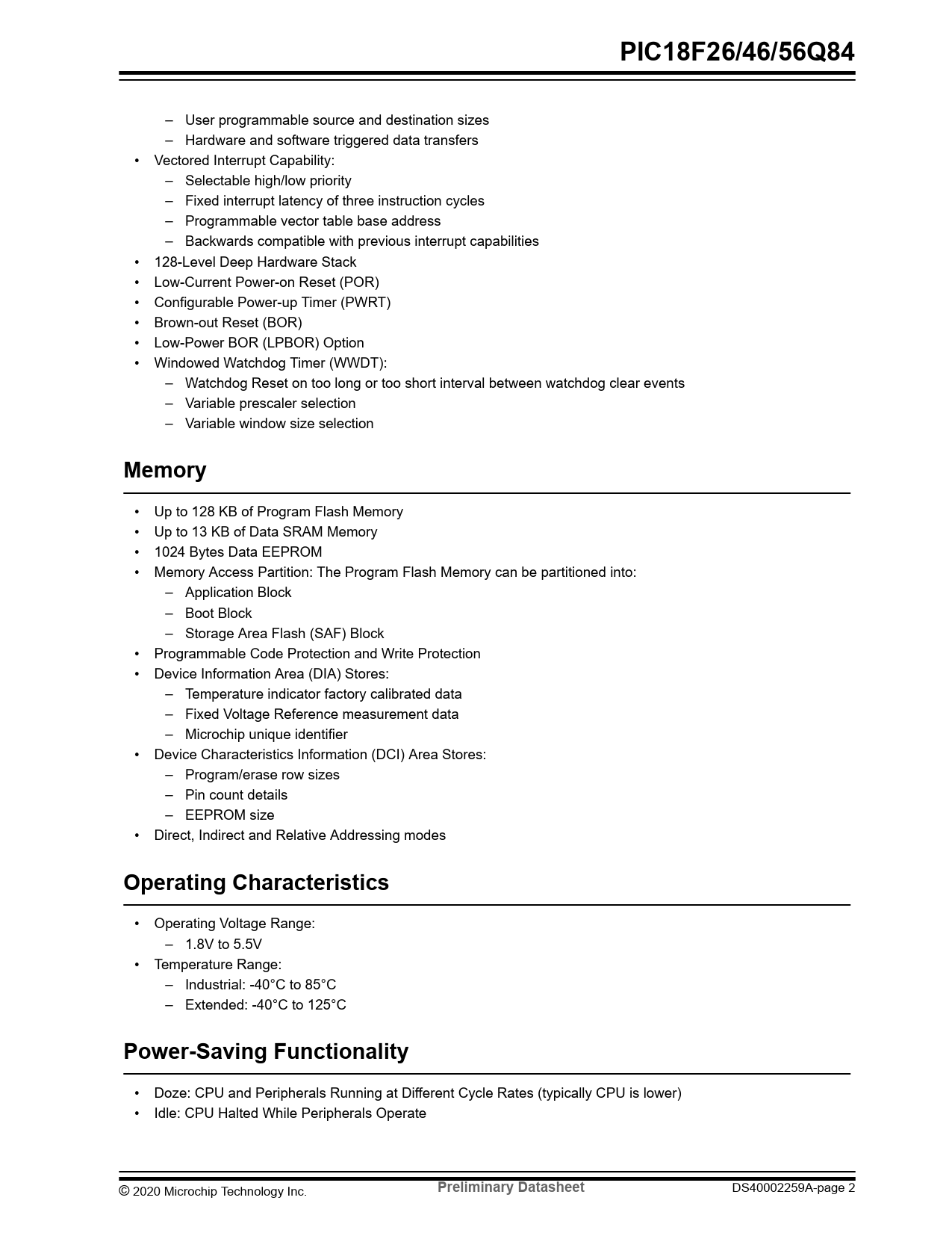PIC18F26/46/56Q84. Memory. Operating Characteristics. Power-Saving Functionality. Preliminary Datasheet