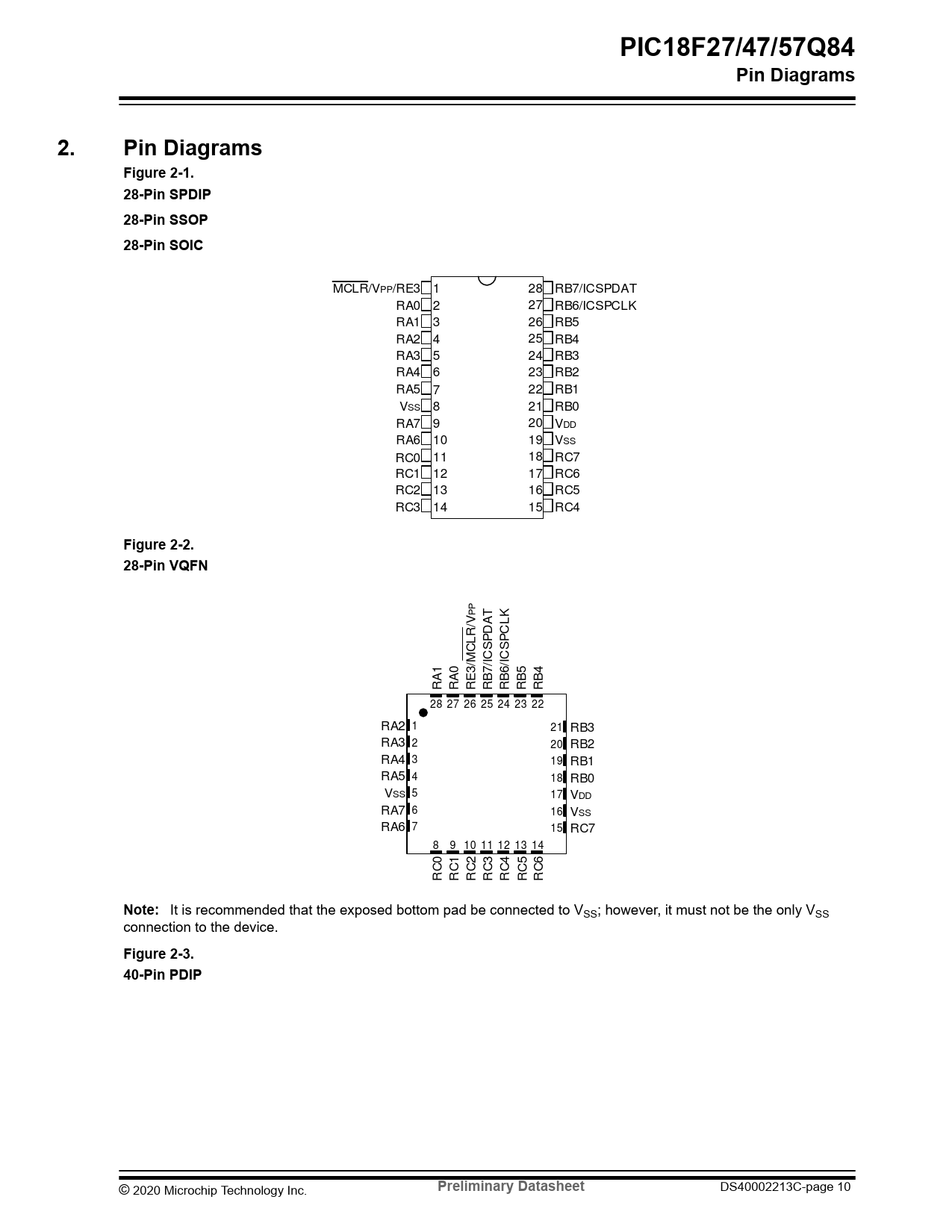 PIC18F27/47/57Q84. Pin Diagrams. Pin Diagrams Figure 2-1. 28-Pin SPDIP. 28-Pin SSOP. 28-Pin SOIC. Figure 2-2. 28-Pin VQFN. Note:
