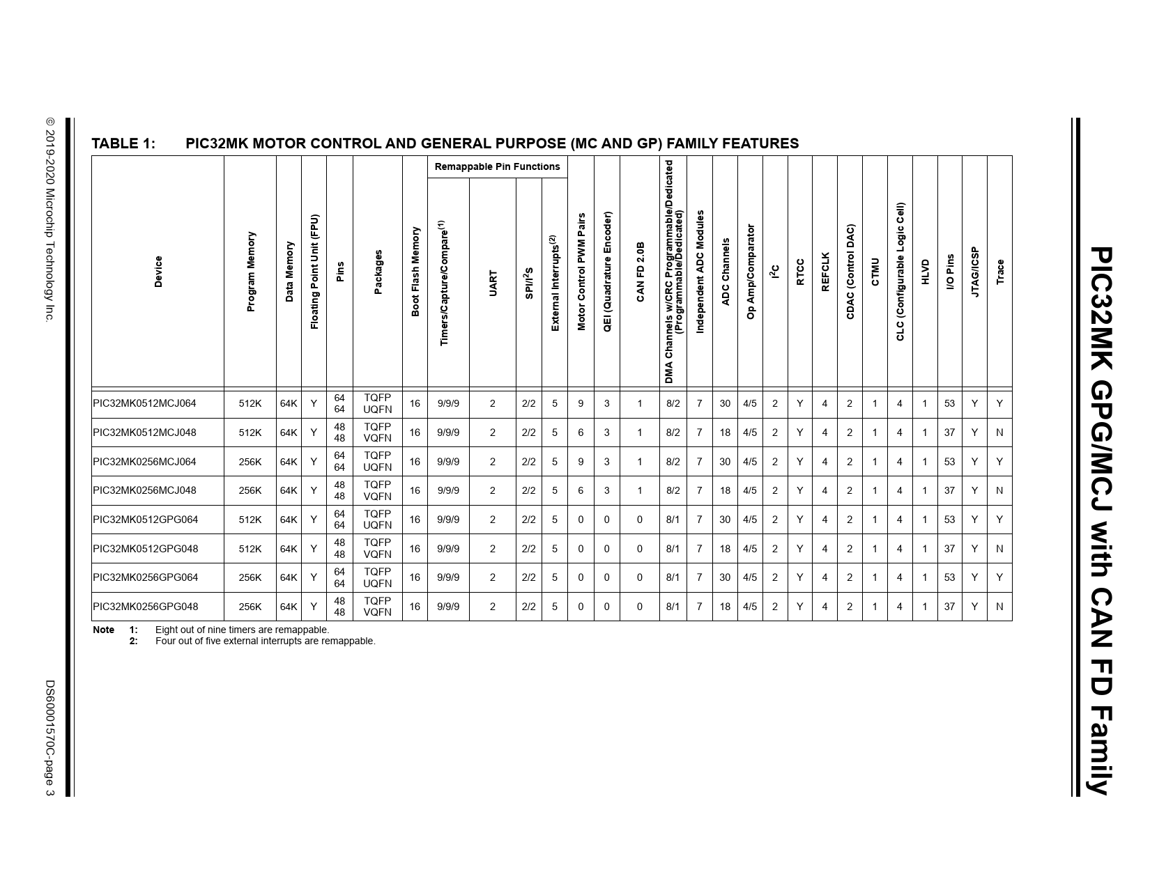 TABLE 1:. PIC32MK MOTOR CONTROL AND GENERAL PURPOSE (MC AND GP) FAMILY FEATURES. Remappable Pin Functions. d te ca. edi. ell). irs