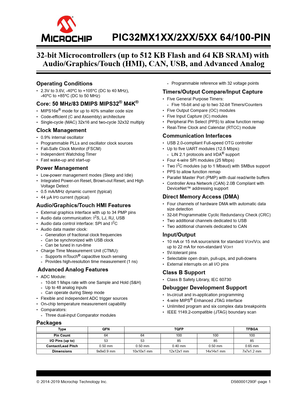 PIC32MX1XX/2XX/5XX 64/100-PIN 32-bit Microcontrollers (up to 512 KB Flash and 64 KB SRAM) with Audio/Graphics/Touch (HMI), CAN, USB, and Advanced Analog Operating Conditions
