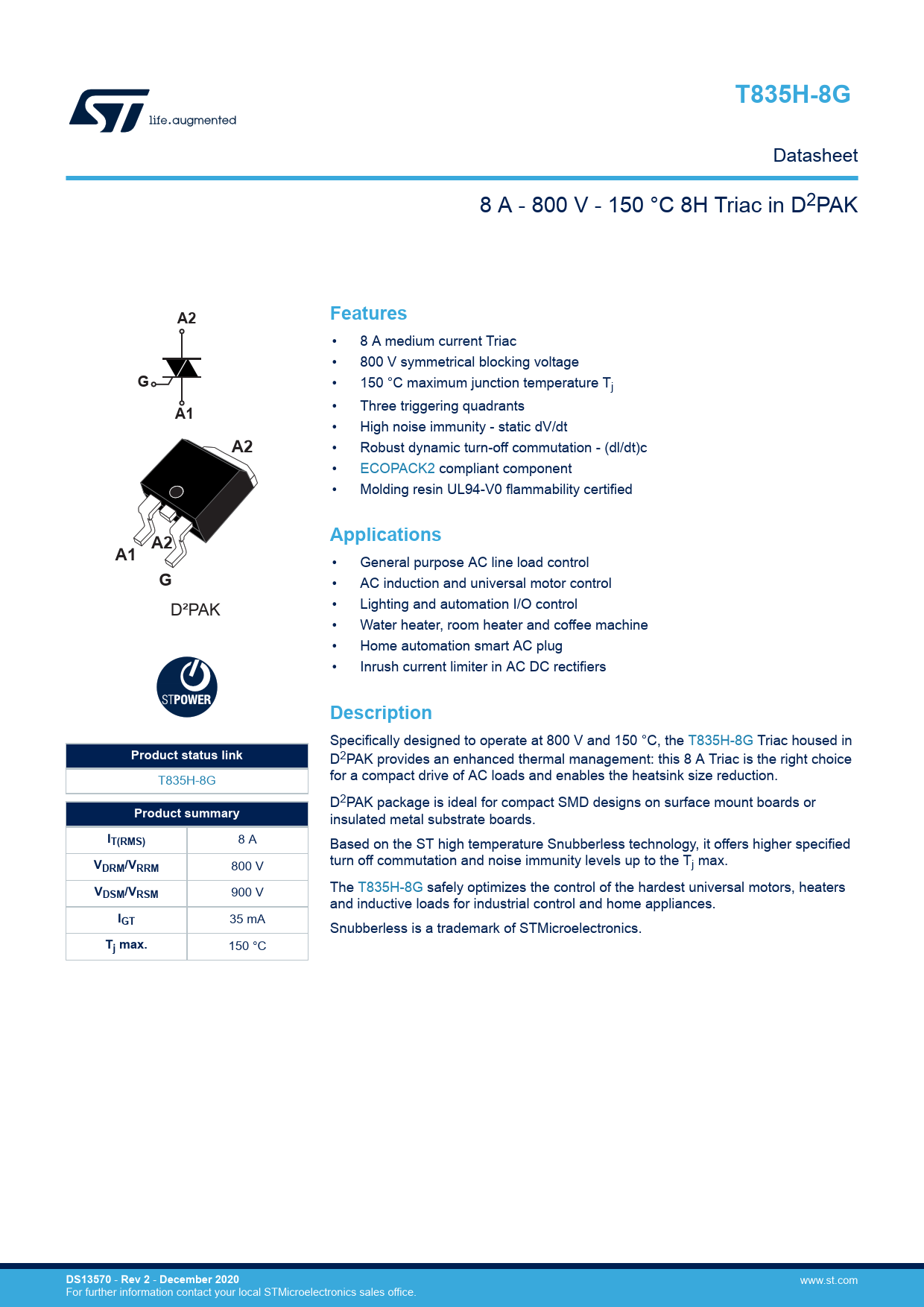 T835H-8G. Features. Applications. Description. Product status link. Product summary. IT(RMS). DRM/VRRM. VDSM/VRSM. IGT. Tj max. DS13570. Rev 2