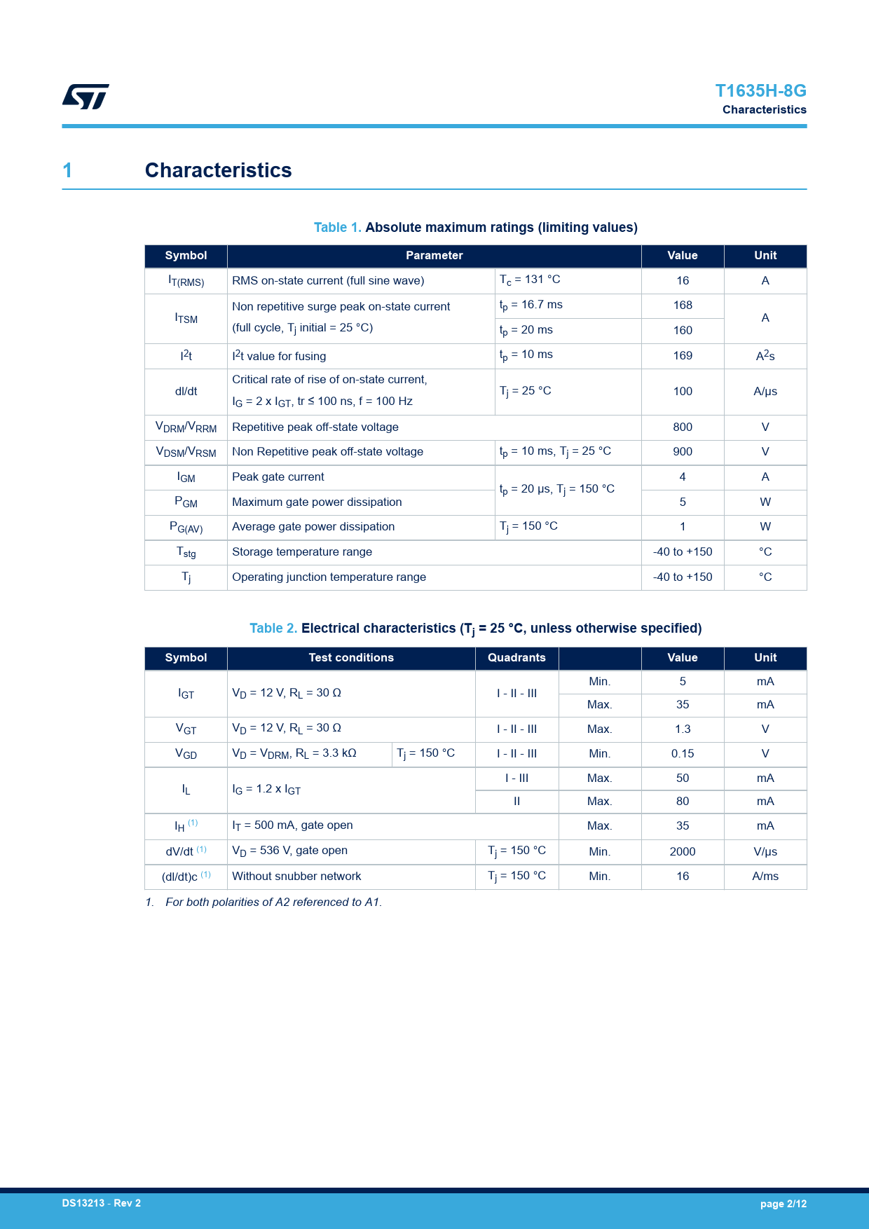 Páginas / Página12 / 2 — T1635H-8G. Characteristics. Table 1. Absolute maximum ratings (limiting …
