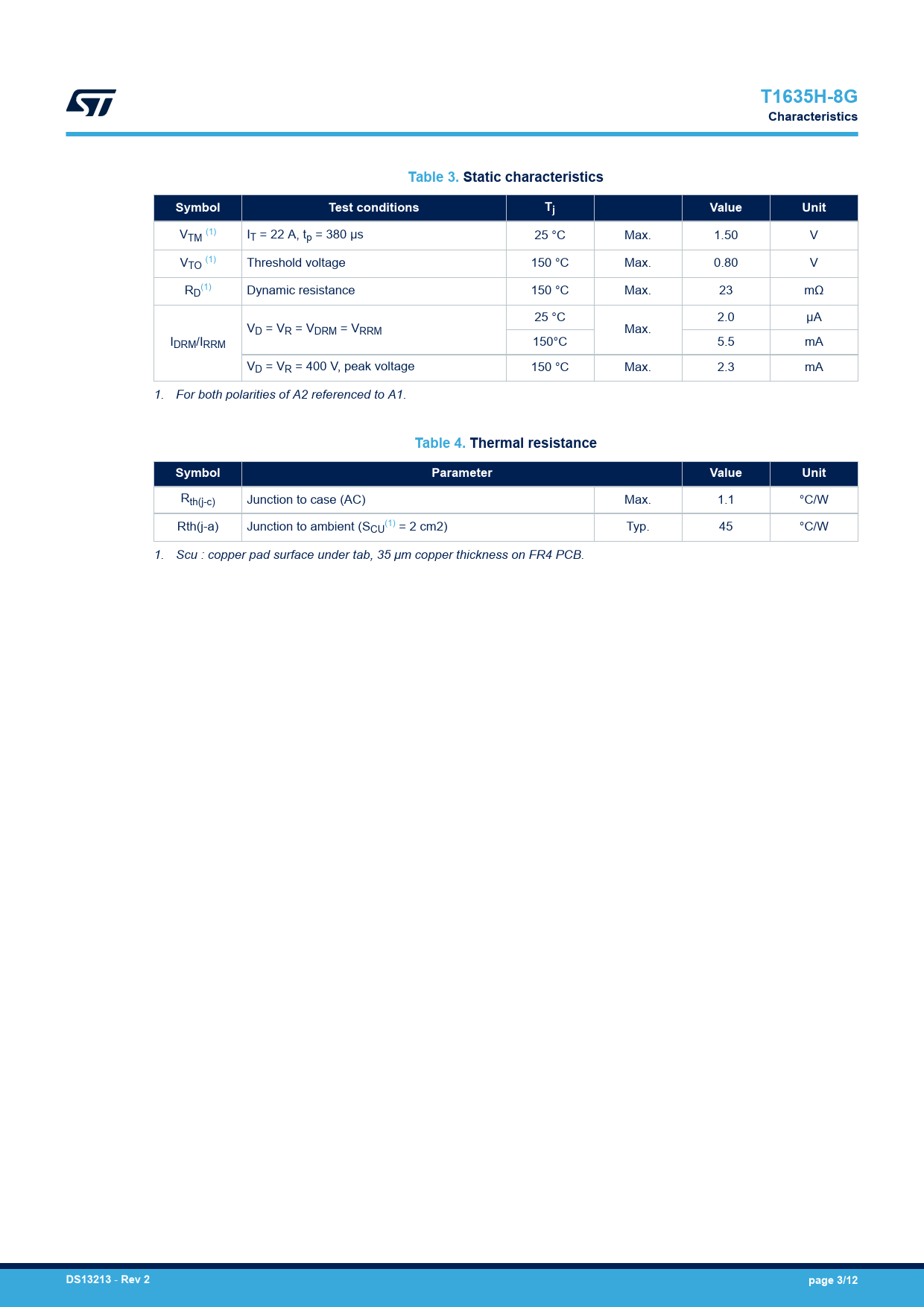 link to page 3 link to page 3 link to page 3 link to page 3 T1635H-8GCharacteristicsTable 3. Static characteristicsSymbolTest conditionsTjValueUnit VTM (1) IT = 22 A, tp = 380 µs 25 °C Max. 1.50 V VTO (1) Threshold voltage 150 °C Max. 0.80 V R (1) D Dynamic resistance 150 °C Max. 23 mΩ 25 °C 2.0 µA VD = VR = VDRM = VRRM Max. IDRM/IRRM 150°C 5.5 mA VD = VR = 400 V, peak voltage 150 °C Max. 2.3 mA 1. For both polarities of A2 referenced to A1. Table 4. Thermal resistanceSymbolParameterValueUnit Rth(j-c) Junction to case (AC) Max. 1.1 °C/W Rth(j-a) Junction to ambient (S (1) CU = 2 cm2) Typ. 45 °C/W 1. Scu : copper pad surface under tab, 35 μm copper thickness on FR4 PCB. DS13213 - Rev 2page 3/12 Document Outline 1 Characteristics 1.1 Characteristics (curves) 2 Package information 2.1 D²PAK package information 3 Ordering information Revision history