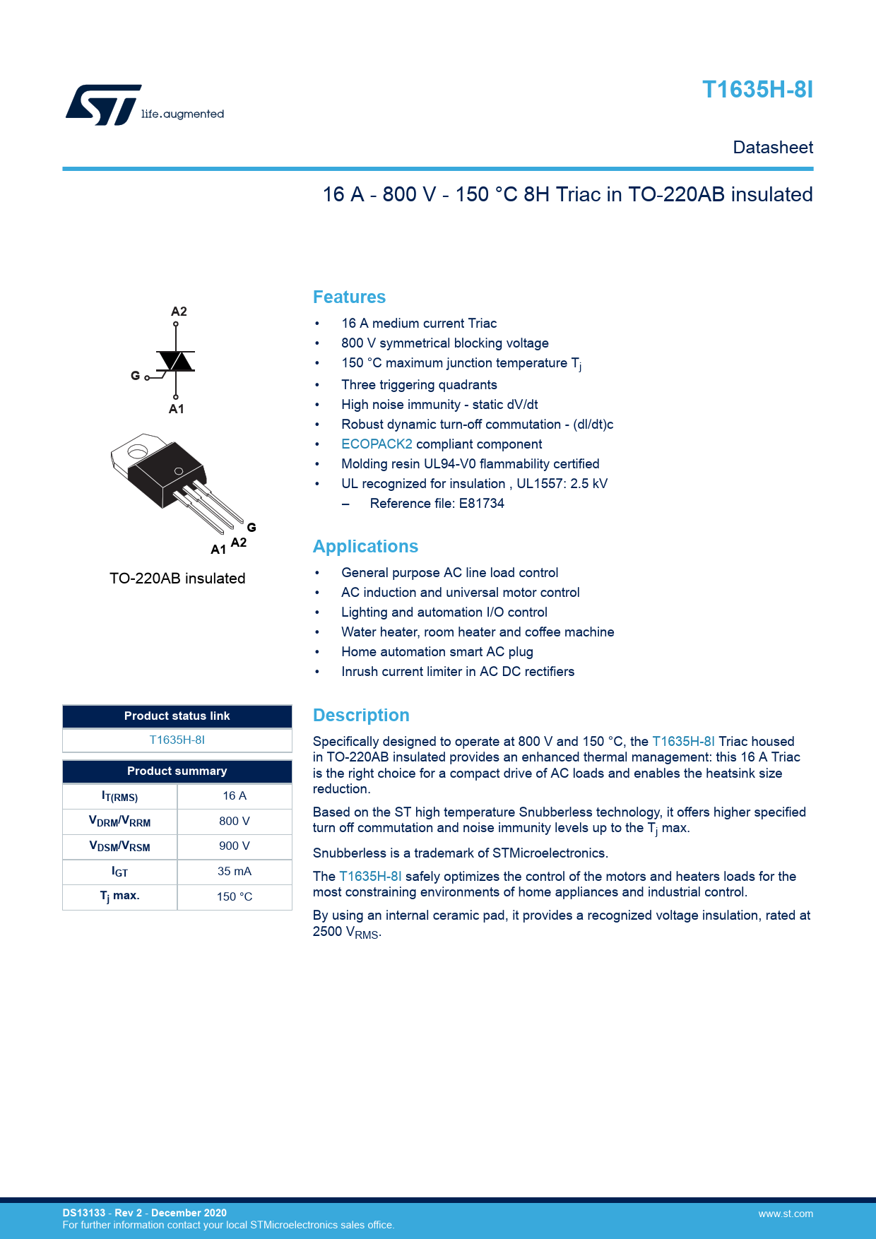 T1635H-8I Datasheet 16 A - 800 V - 150 °C 8H Triac in TO-220AB insulated FeaturesA2 • 16 A medium current Triac • 800 V symmetrical blocking voltage • 150 °C maximum junction temperature Tj G • Three triggering quadrants A1 • High noise immunity - static dV/dt • Robust dynamic turn-off commutation - (dl/dt)c • ECOPACK2 compliant component • Molding resin UL94-V0 flammability certified • UL recognized for insulation , UL1557: 2.5 kV – Reference file: E81734 GA1 A2Applications TO-220AB insulated • General purpose AC line load control • AC induction and universal motor control • Lighting and automation I/O control • Water heater, room heater and coffee machine • Home automation smart AC plug • Inrush current limiter in AC DC rectifiers Product status linkDescription T1635H-8I Specifically designed to operate at 800 V and 150 °C, the T1635H-8I Triac housed in TO-220AB insulated provides an enhanced thermal management: this 16 A Triac Product summary is the right choice for a compact drive of AC loads and enables the heatsink size reduction. IT(RMS) 16 A Based on the ST high temperature Snubberless technology, it offers higher specified VDRM/VRRM 800 V turn off commutation and noise immunity levels up to the Tj max. VDSM/VRSM 900 V Snubberless is a trademark of STMicroelectronics. IGT 35 mA The T1635H-8I safely optimizes the control of the motors and heaters loads for the T most constraining environments of home appliances and industrial control. j max. 150 °C By using an internal ceramic pad, it provides a recognized voltage insulation, rated at 2500 VRMS. DS13133 - Rev 2 - December 2020 www.st.com For further information contact your local STMicroelectronics sales office. Document Outline 1 Characteristics 1.1 Characteristics (curves) 2 Package information 2.1 TO-220AB insulated package information 3 Ordering information Revision history