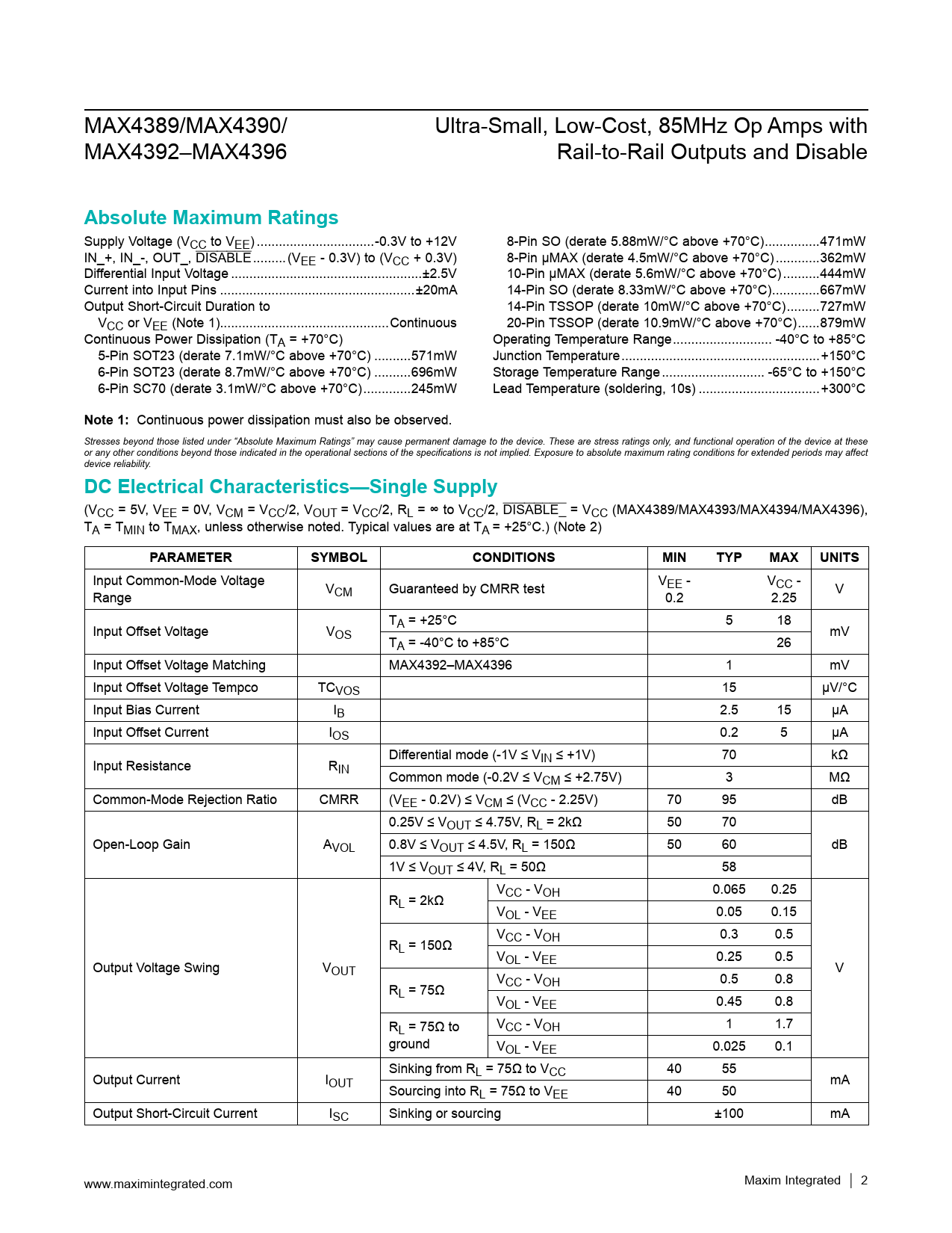 MAX4389/MAX4390/ Ultra-Small, Low-Cost, 85MHz Op Amps with MAX4392–MAX4396 Rail-to-Rail Outputs and Disable Absolute Maximum Ratings Supply Voltage (VCC to VEE) ..-0.3V to +12V 8-Pin SO (derate 5.88mW/°C above +70°C) ...471mW IN_+, IN_-, OUT_, DISABLE ...(VEE - 0.3V) to (VCC + 0.3V) 8-Pin μMAX (derate 4.5mW/°C above +70°C) ..362mW Differential Input Voltage ..±2.5V 10-Pin μMAX (derate 5.6mW/°C above +70°C) ..444mW Current into Input Pins ...±20mA 14-Pin SO (derate 8.33mW/°C above +70°C) ...667mW Output Short-Circuit Duration to 14-Pin TSSOP (derate 10mW/°C above +70°C) ...727mW VCC or VEE (Note 1)..Continuous 20-Pin TSSOP (derate 10.9mW/°C above +70°C) ..879mW Continuous Power Dissipation (TA = +70°C) Operating Temperature Range ... -40°C to +85°C 5-Pin SOT23 (derate 7.1mW/°C above +70°C) ..571mW Junction Temperature ..+150°C 6-Pin SOT23 (derate 8.7mW/°C above +70°C) ..696mW Storage Temperature Range .. -65°C to +150°C 6-Pin SC70 (derate 3.1mW/°C above +70°C) ...245mW Lead Temperature (soldering, 10s) ...+300°C Note 1: Continuous power dissipation must also be observed. Stresses beyond those listed under “Absolute Maximum Ratings” may cause permanent damage to the device. These are stress ratings only, and functional operation of the device at these or any other conditions beyond those indicated in the operational sections of the specifications is not implied. Exposure to absolute maximum rating conditions for extended periods may affect device reliability. DC Electrical Characteristics—Single Supply (VCC = 5V, VEE = 0V, VCM = VCC/2, VOUT = VCC/2, RL = ∞ to VCC/2, DISABLE_ = VCC (MAX4389/MAX4393/MAX4394/MAX4396), TA = TMIN to TMAX, unless otherwise noted. Typical values are at TA = +25°C.) (Note 2) PARAMETERSYMBOLCONDITIONSMINTYPMAXUNITS Input Common-Mode Voltage VCC - Range VCM Guaranteed by CMRR test VEE - 0.2 2.25 V T Input Offset Voltage V A = +25°C 5 18 OS mV TA = -40°C to +85°C 26 Input Offset Voltage Matching MAX4392–MAX4396 1 mV Input Offset Voltage Tempco TCVOS 15 µV/°C Input Bias Current IB 2.5 15 µA Input Offset Current IOS 0.2 5 µA Differential mode (-1V ≤ V Input Resistance R IN ≤ +1V) 70 kΩ IN Common mode (-0.2V ≤ VCM ≤ +2.75V) 3 MΩ Common-Mode Rejection Ratio CMRR (VEE - 0.2V) ≤ VCM ≤ (VCC - 2.25V) 70 95 dB 0.25V ≤ VOUT ≤ 4.75V, RL = 2kΩ 50 70 Open-Loop Gain AVOL 0.8V ≤ VOUT ≤ 4.5V, RL = 150Ω 50 60 dB 1V ≤ VOUT ≤ 4V, RL = 50Ω 58 V R CC - VOH 0.065 0.25 L = 2kΩ VOL - VEE 0.05 0.15 V R CC - VOH 0.3 0.5 L = 150Ω V Output Voltage Swing V OL - VEE 0.25 0.5 OUT V V R CC - VOH 0.5 0.8 L = 75Ω VOL - VEE 0.45 0.8 RL = 75Ω to VCC - VOH 1 1.7 ground VOL - VEE 0.025 0.1 Sinking from R Output Current I L = 75Ω to VCC 40 55 OUT mA Sourcing into RL = 75Ω to VEE 40 50 Output Short-Circuit Current ISC Sinking or sourcing ±100 mA www.maximintegrated.com Maxim Integrated │ 2