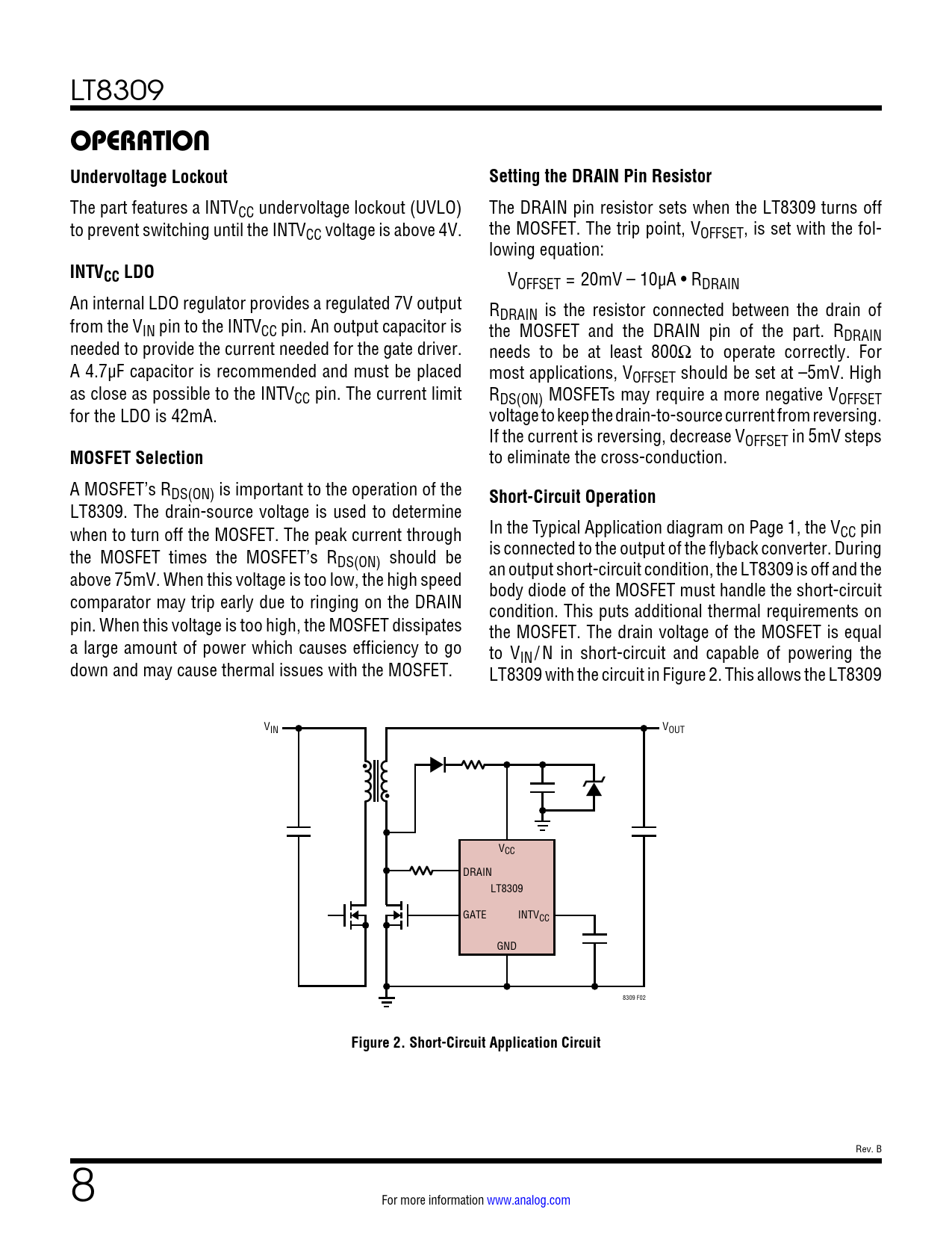 The part features a INTVCC undervoltage lockout (UVLO) The DRAIN pin resistor sets when the LT8309 turns off to prevent switching until the INTVCC voltage is above 4V. the MOSFET. The trip point, VOFFSET, is set with the fol- lowing equation: