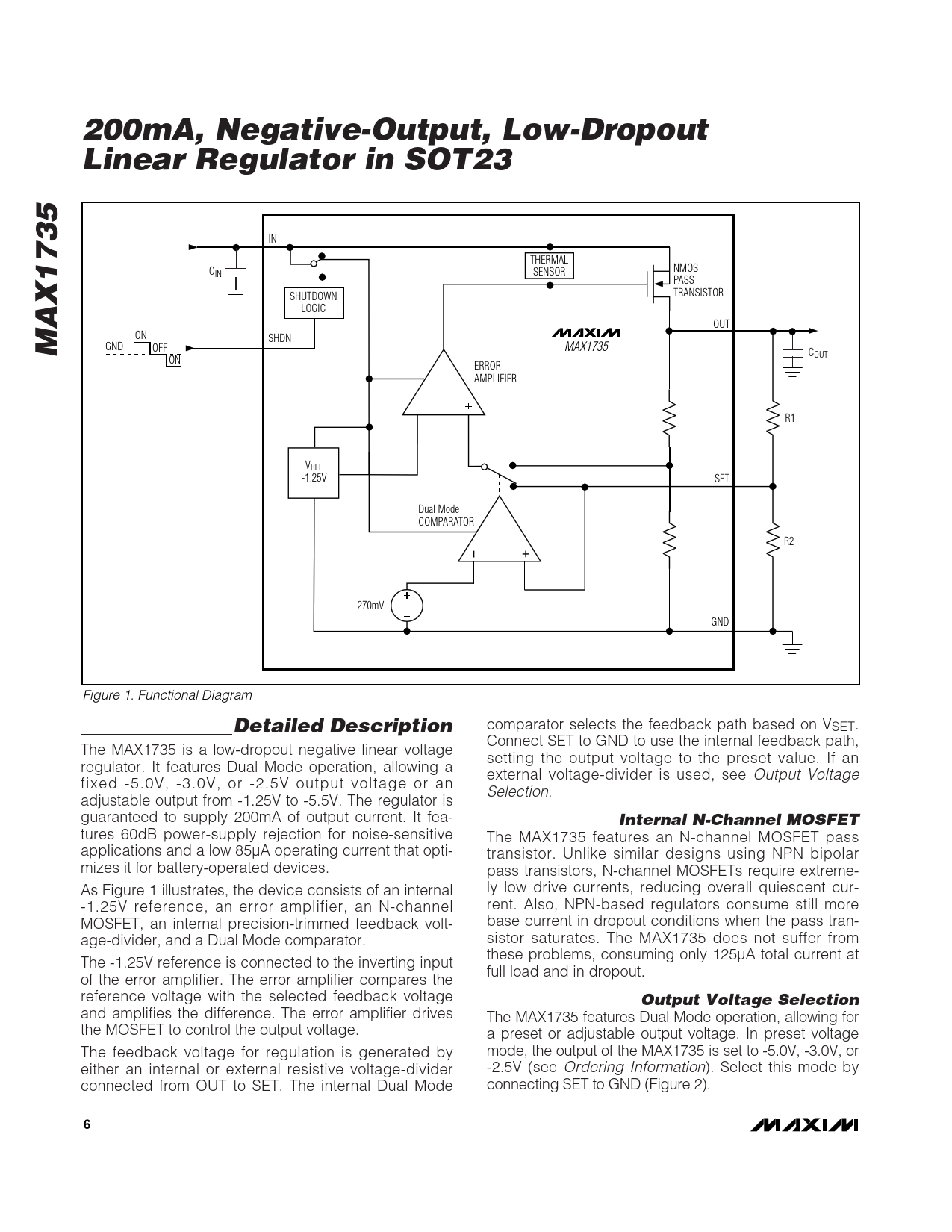 200mA, Negative-Output, Low-Dropout Linear Regulator in SOT23. MAX1735. Detailed Description. Internal N-Channel MOSFET