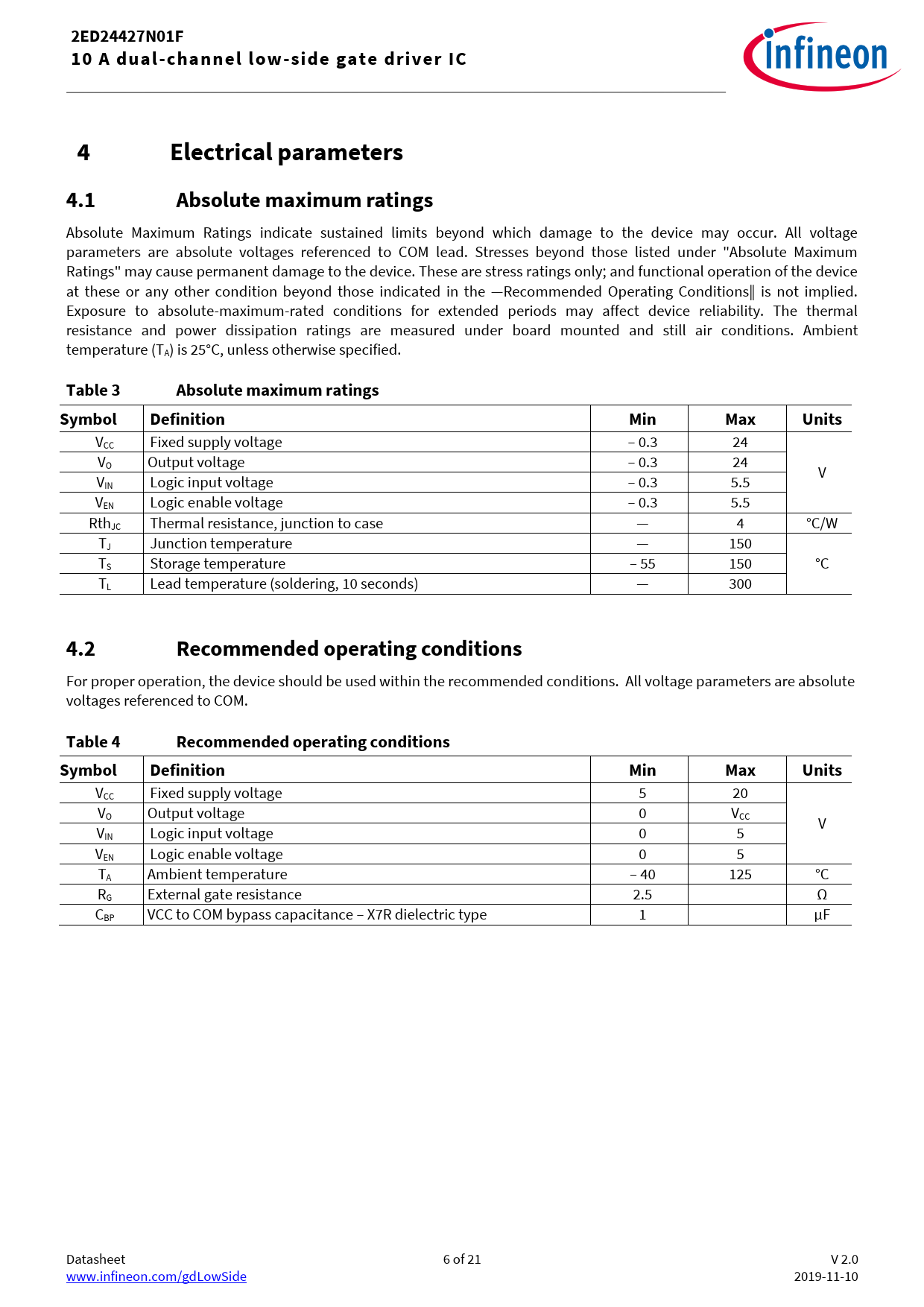 2ED24427N01F10 A dual-channel low-side gate driver IC4Electrical parameters4.1Absolute maximum ratings Absolute Maximum Ratings indicate sustained limits beyond which damage to the device may occur. All voltage parameters are absolute voltages referenced to COM lead. Stresses beyond those listed under "Absolute Maximum Ratings" may cause permanent damage to the device. These are stress ratings only; and functional operation of the device at these or any other condition beyond those indicated in the ―Recommended Operating Conditions‖ is not implied. Exposure to absolute-maximum-rated conditions for extended periods may affect device reliability. The thermal resistance and power dissipation ratings are measured under board mounted and still air conditions. Ambient temperature (TA) is 25°C, unless otherwise specified. Table 3Absolute maximum ratingsSymbolDefinitionMinMaxUnits VCC Fixed supply voltage – 0.3 24 VO Output voltage – 0.3 24 V VIN Logic input voltage – 0.3 5.5 VEN Logic enable voltage – 0.3 5.5 RthJC Thermal resistance, junction to case — 4 °C/W TJ Junction temperature — 150 TS Storage temperature – 55 150 °C TL Lead temperature (soldering, 10 seconds) — 300 4.2Recommended operating conditions For proper operation, the device should be used within the recommended conditions. All voltage parameters are absolute voltages referenced to COM. Table 4Recommended operating conditionsSymbolDefinitionMinMaxUnits VCC Fixed supply voltage 5 20 VO Output voltage 0 VCC V VIN Logic input voltage 0 5 VEN Logic enable voltage 0 5 TA Ambient temperature – 40 125 °C RG External gate resistance 2.5 Ω CBP VCC to COM bypass capacitance – X7R dielectric type 1 µF Datasheet 6 of 21 V 2.0 www.infineon.com/gdLowSide 2019-11-10