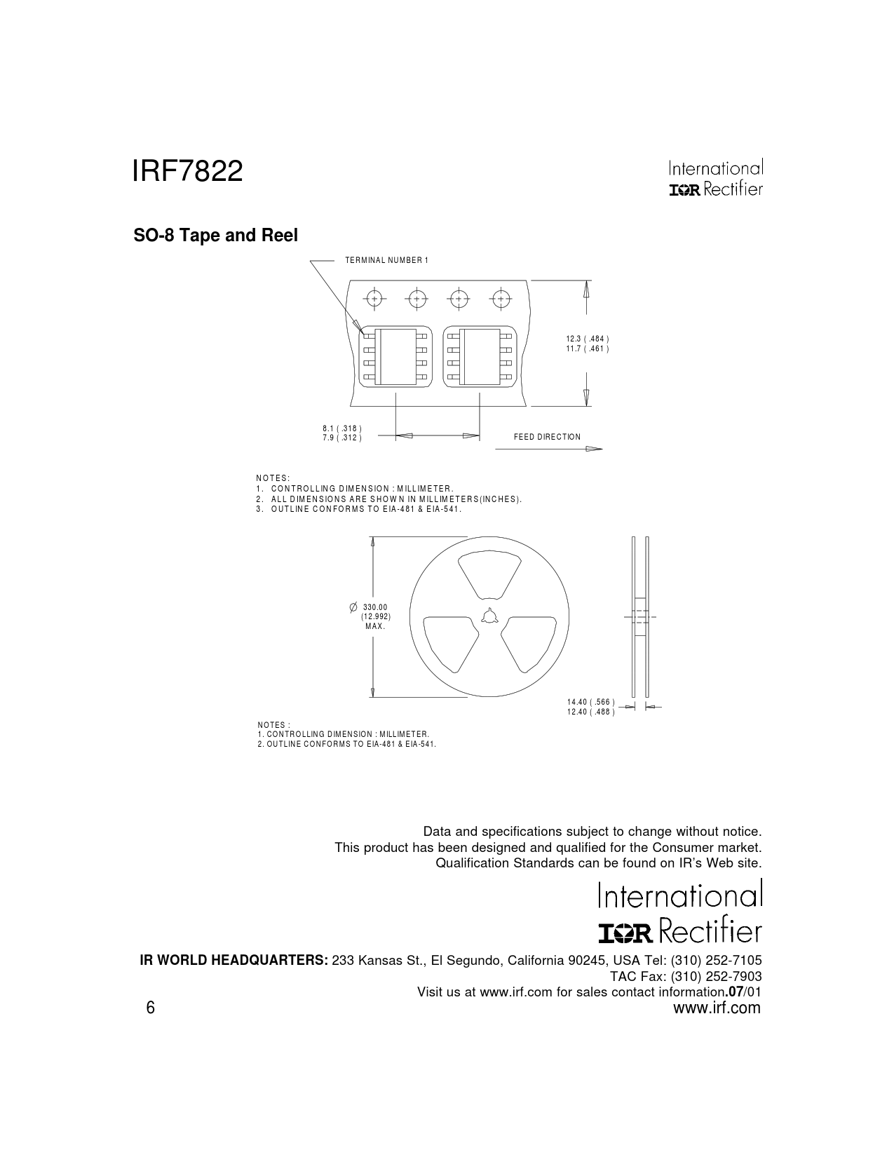 T E R M IN A L N U M B E R 1 12 .3 ( .4 8 4 ) 11 .7 ( .4 6 1 ) 8 .1 ( .3 1 8 ) 7 .9 ( .3 1 2 ) F E E D D IR E C T IO N N O T E S : 1 . C O N T R O L L IN G D IM E N S IO N : M IL L IM E T E R . 2 . A L L D IM E N S IO N S A R E S H O W N I N M IL L IM E T E R S (IN C H E S ). 3 . O U T L IN E C O N F O R M S T O E IA -4 8 1 & E IA -5 4 1 . 33 0 .0 0 (1 2 .9 92 ) M A X . 1 4 .4 0 ( .5 6 6 ) 1 2 .4 0 ( .4 8 8 ) N O T E S : 1 . C O N T R O L LIN G D IM E N S IO N : M ILL IM E T E R . 2 . O U T L IN E C O N F O R M S T O E IA -4 8 1 & E IA -5 4 1. Data and specifications subject to change without notice. This product has been designed and qualified for the Consumer market. Qualification Standards can be found on IR’s Web site.