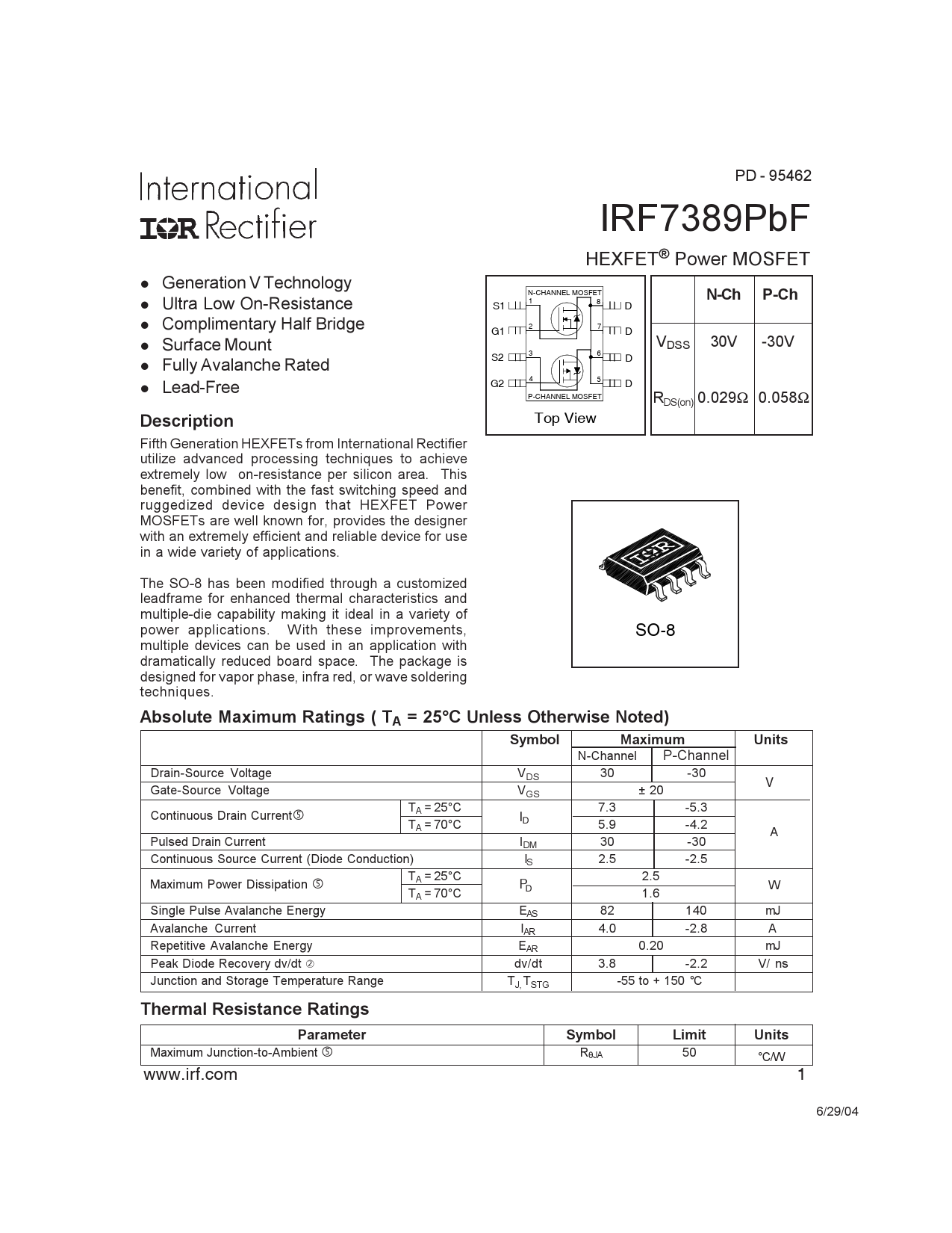 PD - 95462 IRF7389PbF HEXFET® Power MOSFET l Generation V Technology N-CHANNEL MOSFET
