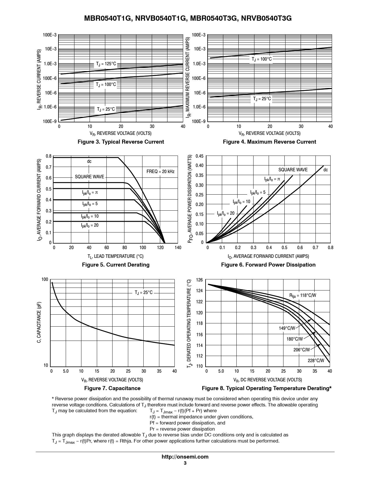 MBR0540T1G, NRVB0540T1G, MBR0540T3G, NRVB0540T3G 100E-3 100E-3 10E-3 (AMPS) 10E-3 T (AMPS) J = 100C 1.0E-3 TJ = 125C 1.0E-3 100E-6 100E-6 TJ = 100C 10E-6 10E-6 TJ = 25C , REVERSE CURRENT R 1.0E-6 I T 1.0E-6 J = 25C , MAXIMUM REVERSE CURRENT I R 100E-9 100E-9 0 10 20 30 40 0 10 20 30 40 VR, REVERSE VOLTAGE (VOLTS) VR, REVERSE VOLTAGE (VOLTS) Figure 3. Typical Reverse CurrentFigure 4. Maximum Reverse Current 0.8 0.45 dc TTS) A 0.40 0.7 SQUARE WAVE dc (AMPS) FREQ = 20 kHz 0.35 0.6 SQUARE WAVE TION (W I A pk/Io = p 0.30 0.5 CURRENT I I pk/Io = p pk/Io = 5 0.25 0.4 ARD I W pk/Io = 10 Ipk/Io = 5 0.20 0.3 FOR 0.15 Ipk/Io = 20 Ipk/Io = 10 0.2 0.10 Ipk/Io = 20 VERAGE VERAGE POWER DISSIP 0.1 , A 0.05 , A I O FO 0 P 0 0 20 40 60 80 100 120 140 0 0.1 0.2 0.3 0.4 0.5 0.6 0.7 0.8 TL, LEAD TEMPERATURE (C) IO, AVERAGE FORWARD CURRENT (AMPS) Figure 5. Current DeratingFigure 6. Forward Power Dissipation 100 126 T 124 J = 25C TURE ( C) Rtja = 118C/W 122 120 TEMPERA ANCE (pF) 118 ACIT TING 149C/W 116 180C/W C, CAP 114 TED OPERA 206C/W 112 , DERA 228C/W 10 T J 110 0 5.0 10 15 20 25 30 35 40 0 5.0 10 15 20 25 30 35 40 VR, REVERSE VOLTAGE (VOLTS) VR, DC REVERSE VOLTAGE (VOLTS) Figure 7. CapacitanceFigure 8. Typical Operating Temperature Derating* * Reverse power dissipation and the possibility of thermal runaway must be considered when operating this device under any reverse voltage conditions. Calculations of TJ therefore must include forward and reverse power effects. The allowable operating TJ may be calculated from the equation: TJ = TJmax − r(t)(Pf + Pr) where r(t) = thermal impedance under given conditions, Pf = forward power dissipation, and Pr = reverse power dissipation This graph displays the derated allowable TJ due to reverse bias under DC conditions only and is calculated as TJ = TJmax − r(t)Pr, where r(t) = Rthja. For other power applications further calculations must be performed. http://onsemi.com3