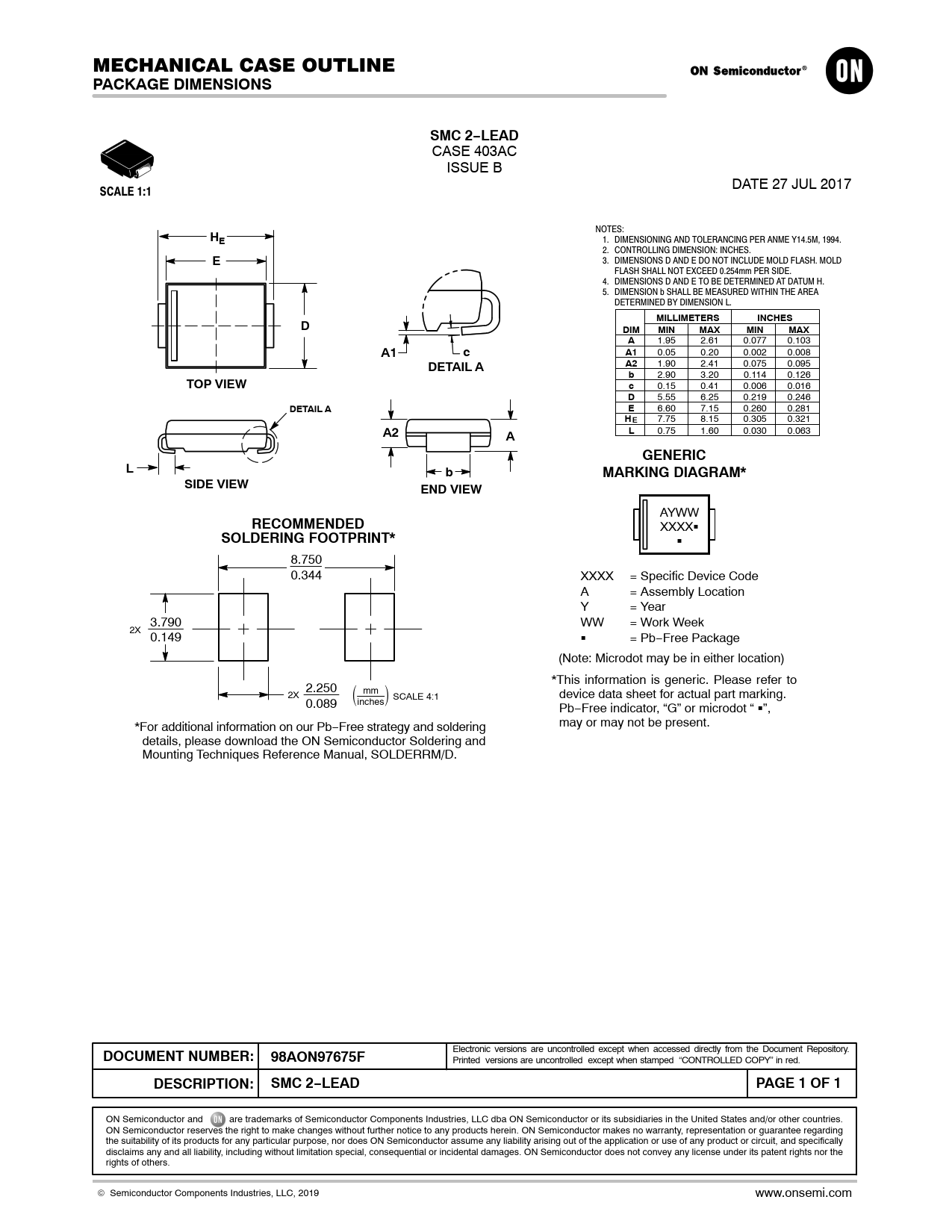 PACKAGE DIMENSIONS. SMC 2−LEAD. SCALE 1:1. MILLIMETERS. INCHES. DIM. MIN. MAX. DETAIL A. TOP VIEW. GENERIC. MARKING DIAGRAM*. SIDE VIEW. END VIEW