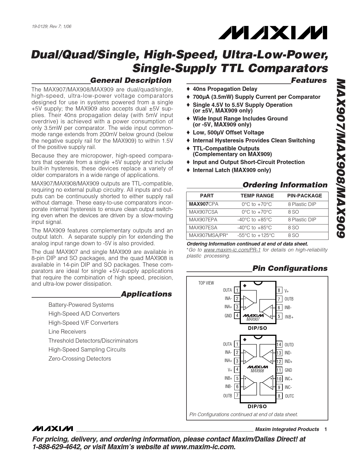 19-0129; Rev 7; 1/06 Dual/Quad/Single, High-Speed, Ultra-Low-Power,Single-Supply TTL Comparators MAX907/MAX908/MAX909General DescriptionFeatures The MAX907/MAX908/MAX909 are dual/quad/single, ♦ 40ns Propagation Delay high-speed, ultra-low-power voltage comparators ♦ 700µA (3.5mW) Supply Current per Comparator designed for use in systems powered from a single ♦ Single 4.5V to 5.5V Supply Operation +5V supply; the MAX909 also accepts dual ±5V sup- (or ±5V, MAX909 only) plies. Their 40ns propagation delay (with 5mV input ♦ Wide Input Range Includes Ground overdrive) is achieved with a power consumption of (or -5V, MAX909 only) only 3.5mW per comparator. The wide input common- mode range extends from 200mV below ground (below ♦ Low, 500µV Offset Voltage the negative supply rail for the MAX909) to within 1.5V ♦ Internal Hysteresis Provides Clean Switching of the positive supply rail. ♦ TTL-Compatible Outputs Because they are micropower, high-speed compara- (Complementary on MAX909) tors that operate from a single +5V supply and include ♦ Input and Output Short-Circuit Protection built-in hysteresis, these devices replace a variety of ♦ Internal Latch (MAX909 only) older comparators in a wide range of applications. MAX907/MAX908/MAX909 outputs are TTL-compatible, Ordering Information requiring no external pullup circuitry. All inputs and out- puts can be continuously shorted to either supply rail PARTTEMP RANGEPIN-PACKAGE without damage. These easy-to-use comparators incor- MAX907 CPA 0°C to +70°C 8 Plastic DIP porate internal hysteresis to ensure clean output switch- MAX907CSA 0°C to +70°C 8 SO ing even when the devices are driven by a slow-moving input signal. MAX907EPA -40°C to +85°C 8 Plastic DIP MAX907ESA -40°C to +85°C 8 SO The MAX909 features complementary outputs and an output latch. A separate supply pin for extending the MAX907MSA/PR* -55°C to +125°C 8 SO analog input range down to -5V is also provided. Ordering Information continued at end of data sheet. The dual MAX907 and single MAX909 are available in *Go to www.maxim-ic.com/PR-1 for details on high-reliability 8-pin DIP and SO packages, and the quad MAX908 is plastic processing. available in 14-pin DIP and SO packages. These com- Pin Configurations parators are ideal for single +5V-supply applications that require the combination of high speed, precision, TOP VIEW and ultra-low power dissipation. OUTA 1 8 V+ Applications INA- 2 7 OUTB Battery-Powered Systems INA+ 3 6 INB- High-Speed A/D Converters GND 4 5 INB+ MAX907 High-Speed V/F Converters DIP/SO Line Receivers Threshold Detectors/Discriminators OUTA 1 14 OUTD High-Speed Sampling Circuits INA- 2 13 IND- Zero-Crossing Detectors INA+ 3 12 IND+ V+ 4 MAX908 11 GND INB+ 5 10 INC+ INB- 6 9 INC- OUTB 7 8 OUTC DIP/SO Pin Configurations continued at end of data sheet. ________________________________________________________________ Maxim Integrated Products1For pricing, delivery, and ordering information, please contact Maxim/Dallas Direct! at 1-888-629-4642, or visit Maxim’s website at www.maxim-ic.com. Document Outline not-recomm-data-sheet-cover.pdf Not Recommended for New Designs not-recomm-data-sheet-coverMAX909.pdf Not Recommended for New Designs