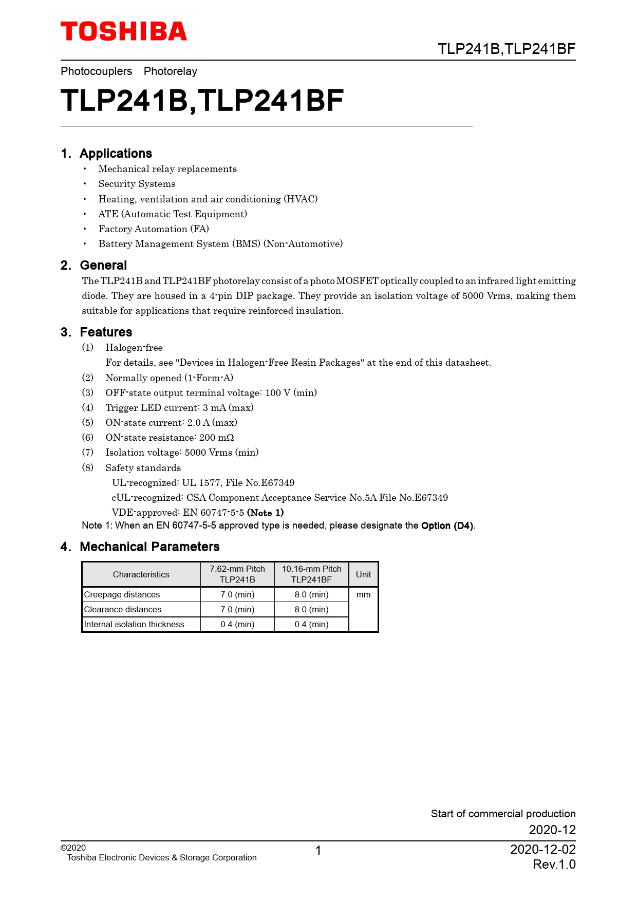 TLP241B,TLP241BF Photocouplers Photorelay TLP241B,TLP241BF 1. Applications • Mechanical relay replacements • Security Systems • Heating, ventilation and air conditioning (HVAC) • ATE (Automatic Test Equipment) • Factory Automation (FA) • Battery Management System (BMS) (Non-Automotive) 2. General The TLP241B and TLP241BF photorelay consist of a photo MOSFET optically coupled to an infrared light emitting diode. They are housed in a 4-pin DIP package. They provide an isolation voltage of 5000 Vrms, making them suitable for applications that require reinforced insulation. 3. Features (1) Halogen-free For details, see "Devices in Halogen-Free Resin Packages" at the end of this datasheet. (2) Normally opened (1-Form-A) (3) OFF-state output terminal voltage: 100 V (min) (4) Trigger LED current: 3 mA (max) (5) ON-state current: 2.0 A (max) (6) ON-state resistance: 200 mΩ (7) Isolation voltage: 5000 Vrms (min) (8) Safety standards UL-recognized: UL 1577, File No.E67349 cUL-recognized: CSA Component Acceptance Service No.5A File No.E67349 VDE-approved: EN 60747-5-5 (Note 1) Note 1: When an EN 60747-5-5 approved type is needed, please designate the Option (D4). 4. Mechanical Parameters 7.62-mm Pitch 10.16-mm Pitch Characteristics Unit TLP241B TLP241BF Creepage distances 7.0 (min) 8.0 (min) mm Clearance distances 7.0 (min) 8.0 (min) Internal isolation thickness 0.4 (min) 0.4 (min) Start of commercial production 2020-12 ©2020 1 2020-12-02 Toshiba Electronic Devices & Storage Corporation Rev.1.0