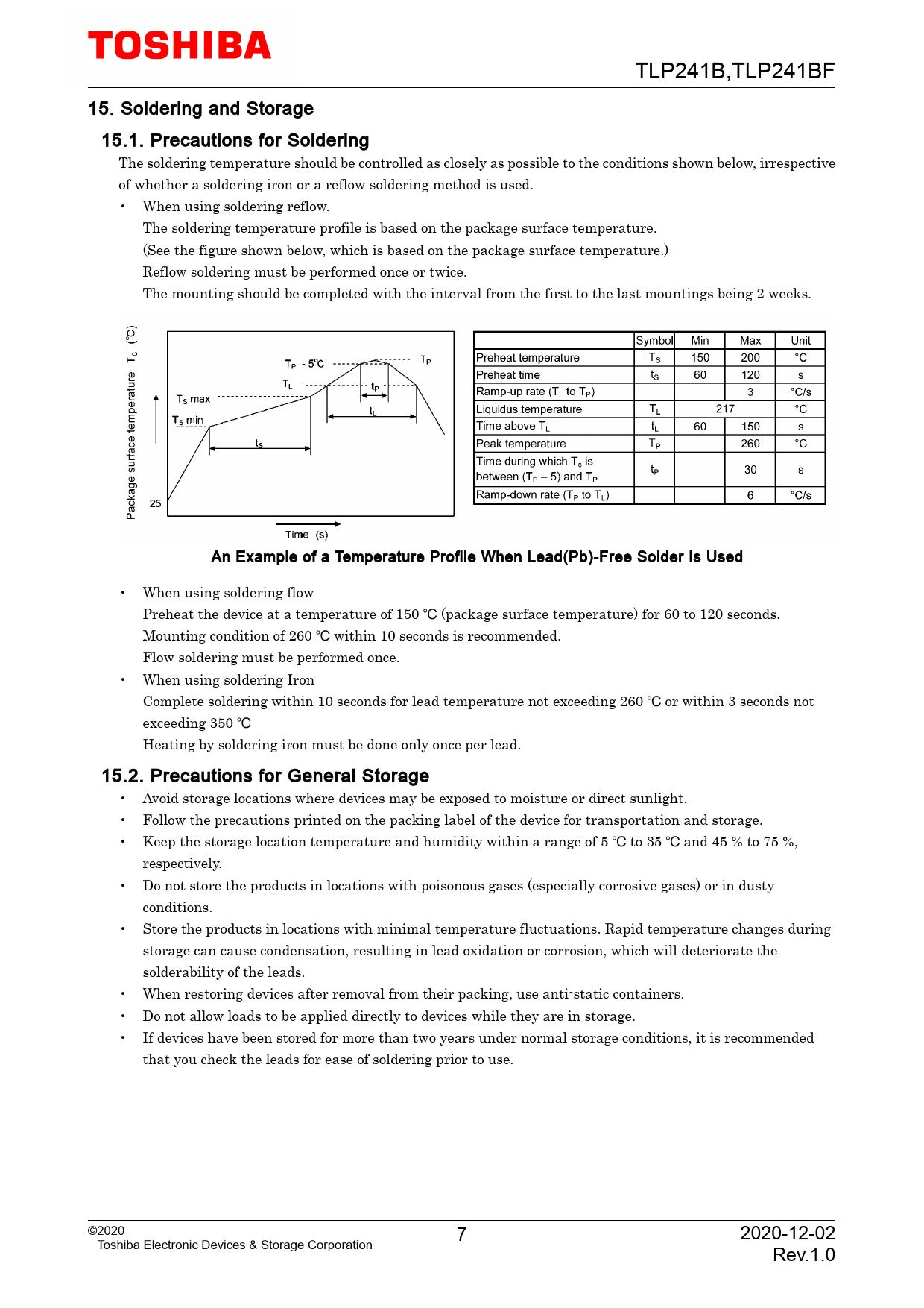 TLP241B,TLP241BF 15. Soldering and Storage 15.1. Precautions for Soldering The soldering temperature should be controlled as closely as possible to the conditions shown below, irrespective of whether a soldering iron or a reflow soldering method is used. • When using soldering reflow. The soldering temperature profile is based on the package surface temperature. (See the figure shown below, which is based on the package surface temperature.) Reflow soldering must be performed once or twice. The mounting should be completed with the interval from the first to the last mountings being 2 weeks. An Example of a Temperature Profile When Lead(Pb)-Free Solder Is Used • When using soldering flow Preheat the device at a temperature of 150 � (package surface temperature) for 60 to 120 seconds. Mounting condition of 260 � within 10 seconds is recommended. Flow soldering must be performed once. • When using soldering Iron Complete soldering within 10 seconds for lead temperature not exceeding 260 � or within 3 seconds not exceeding 350 � Heating by soldering iron must be done only once per lead. 15.2. Precautions for General Storage • Avoid storage locations where devices may be exposed to moisture or direct sunlight. • Follow the precautions printed on the packing label of the device for transportation and storage. • Keep the storage location temperature and humidity within a range of 5 � to 35 � and 45 % to 75 %, respectively. • Do not store the products in locations with poisonous gases (especially corrosive gases) or in dusty conditions. • Store the products in locations with minimal temperature fluctuations. Rapid temperature changes during storage can cause condensation, resulting in lead oxidation or corrosion, which will deteriorate the solderability of the leads. • When restoring devices after removal from their packing, use anti-static containers. • Do not allow loads to be applied directly to devices while they are in storage. • If devices have been stored for more than two years under normal storage conditions, it is recommended that you check the leads for ease of soldering prior to use. ©2020 7 2020-12-02 Toshiba Electronic Devices & Storage Corporation Rev.1.0