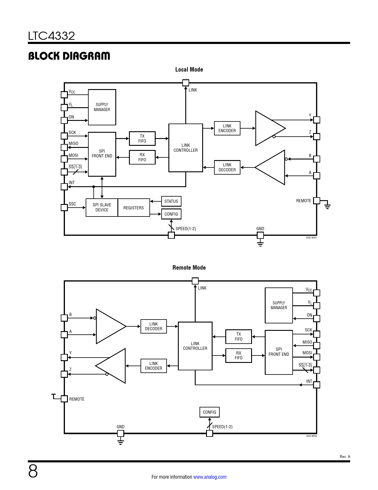 LTC4332 BLOCK DIAGRAMLocal Mode LINK VCC VL SUPPLY MANAGER Y ON LINK ENCODER SCK Z TX FIFO MISO LINK SPI CONTROLLER MOSI FRONT END RX B FIFO LINK SS(1-3) DECODER A INT STATUS REMOTE SSC SPI SLAVE DEVICE REGISTERS CONFIG SPEED(1-2) GND 4332 BD01 Remote Mode LINK VCC SUPPLY VL MANAGER B ON LINK DECODER SCK A TX FIFO LINK MISO CONTROLLER SPI Y RX FRONT END MOSI FIFO LINK SS(1-3) ENCODER Z INT REMOTE CONFIG GND SPEED(1-2) 4332 BD02 Rev. A 8 For more information www.analog.com Document Outline Features Applications Typical Application Description Absolute Maximum Ratings Order Information Electrical Characteristics Pin Configuration Switching Characteristics Typical Performance Characteristics Pin Functions Block Diagram Test Circuits Timing Diagram Applications Information Package Description Typical Application Related Parts