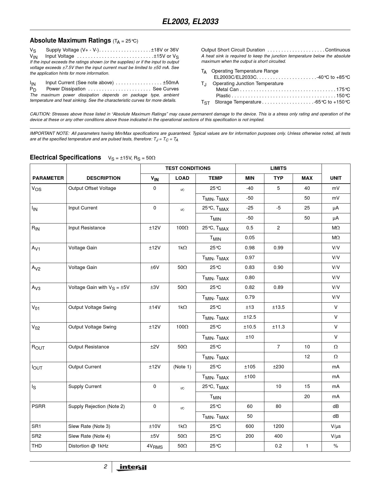 EL2003, EL2033. Absolute Maximum Ratings. Electrical Specifications. TEST CONDITIONS. LIMITS. PARAMETER. DESCRIPTION. UNIT. LOAD. TEMP. MIN