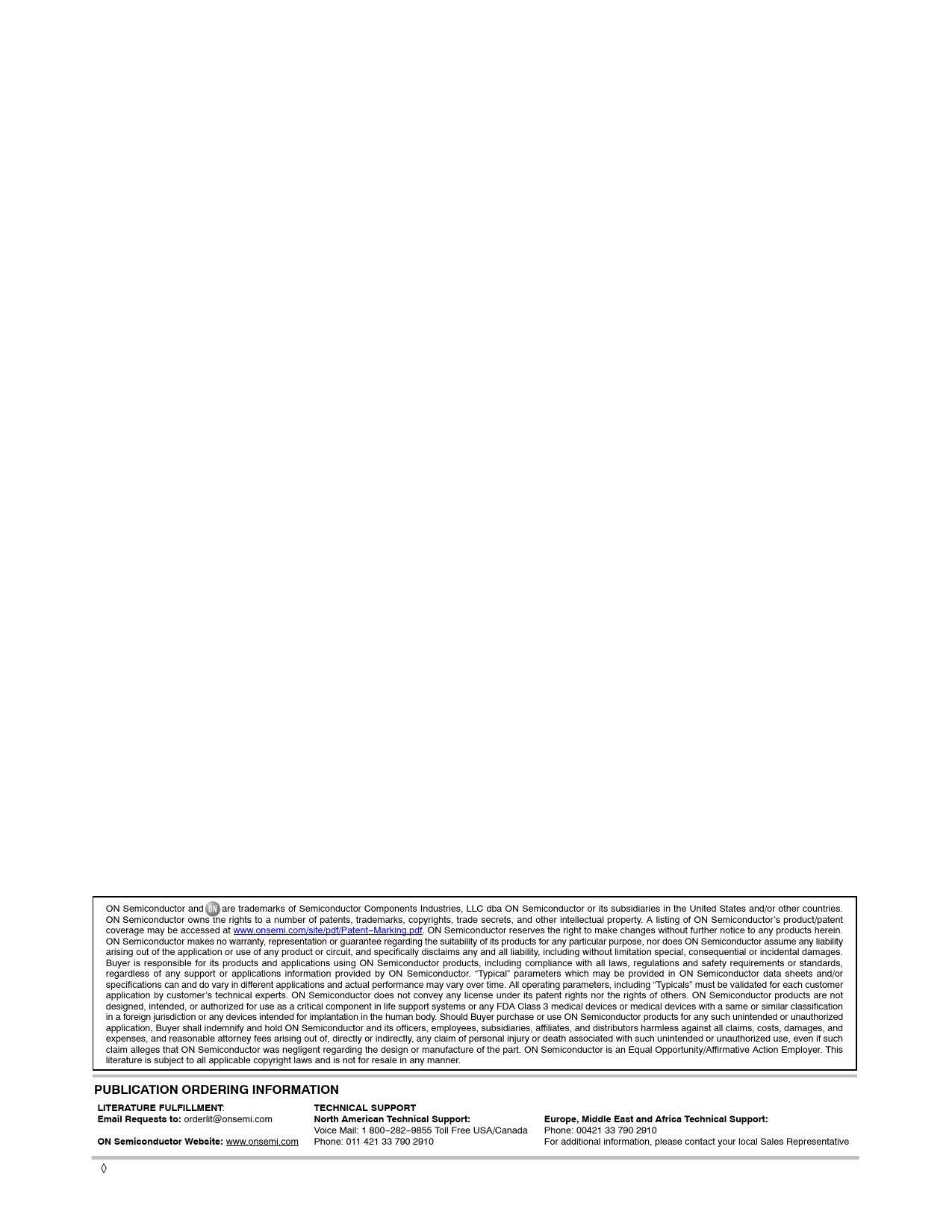 ON Semiconductor and are trademarks of Semiconductor Components Industries, LLC dba ON Semiconductor or its subsidiaries in the United States and/or other countries. ON Semiconductor owns the rights to a number of patents, trademarks, copyrights, trade secrets, and other intellectual property. A listing of ON Semiconductor’s product/patent coverage may be accessed at www.onsemi.com/site/pdf/Patent−Marking.pdf. ON Semiconductor reserves the right to make changes without further notice to any products herein. ON Semiconductor makes no warranty, representation or guarantee regarding the suitability of its products for any particular purpose, nor does ON Semiconductor assume any liability arising out of the application or use of any product or circuit, and specifically disclaims any and all liability, including without limitation special, consequential or incidental damages. Buyer is responsible for its products and applications using ON Semiconductor products, including compliance with all laws, regulations and safety requirements or standards, regardless of any support or applications information provided by ON Semiconductor. “Typical” parameters which may be provided in ON Semiconductor data sheets and/or specifications can and do vary in different applications and actual performance may vary over time. All operating parameters, including “Typicals” must be validated for each customer application by customer’s technical experts. ON Semiconductor does not convey any license under its patent rights nor the rights of others. ON Semiconductor products are not designed, intended, or authorized for use as a critical component in life support systems or any FDA Class 3 medical devices or medical devices with a same or similar classification in a foreign jurisdiction or any devices intended for implantation in the human body. Should Buyer purchase or use ON Semiconductor products for any such unintended or unauthorized application, Buyer shall indemnify and hold ON Semiconductor and its officers, employees, subsidiaries, affiliates, and distributors harmless against all claims, costs, damages, and expenses, and reasonable attorney fees arising out of, directly or indirectly, any claim of personal injury or death associated with such unintended or unauthorized use, even if such claim alleges that ON Semiconductor was negligent regarding the design or manufacture of the part. ON Semiconductor is an Equal Opportunity/Affirmative Action Employer. This literature is subject to all applicable copyright laws and is not for resale in any manner.