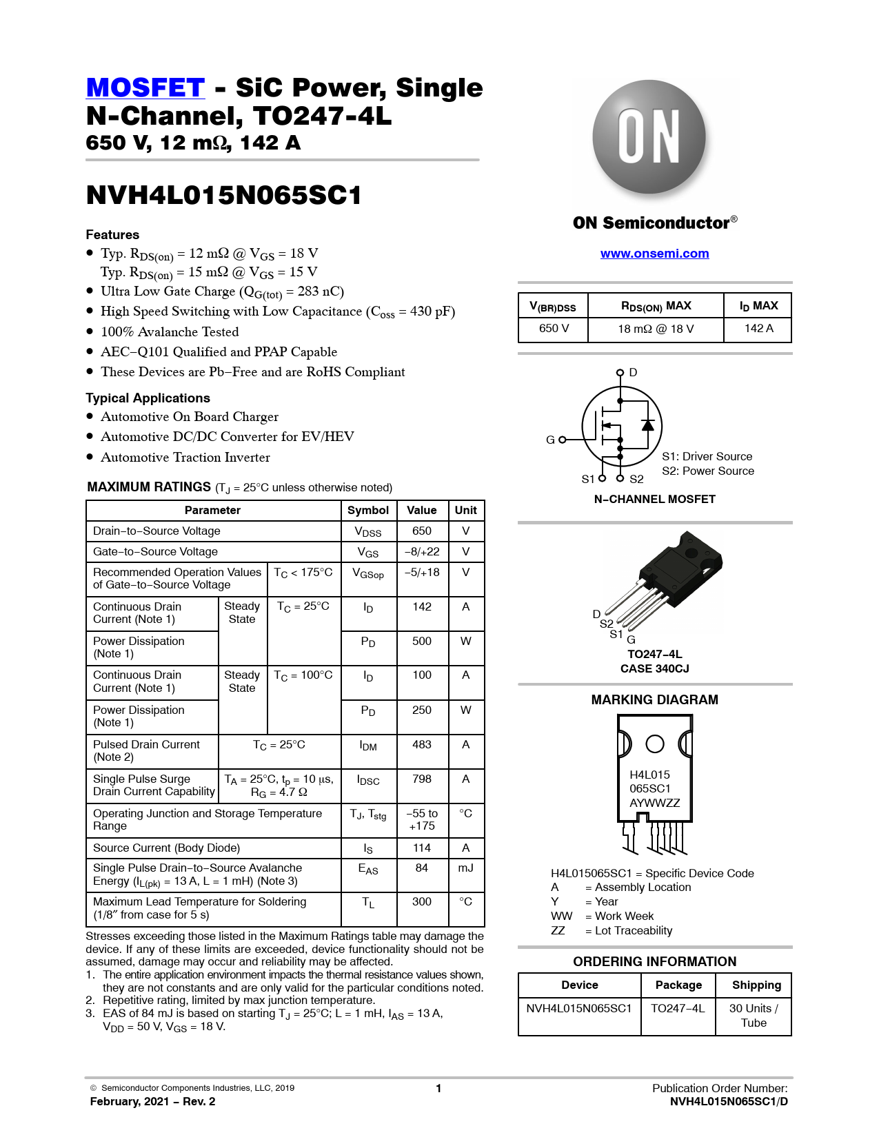 Datasheet NVH4L015N065SC1 (ON Semiconductor)