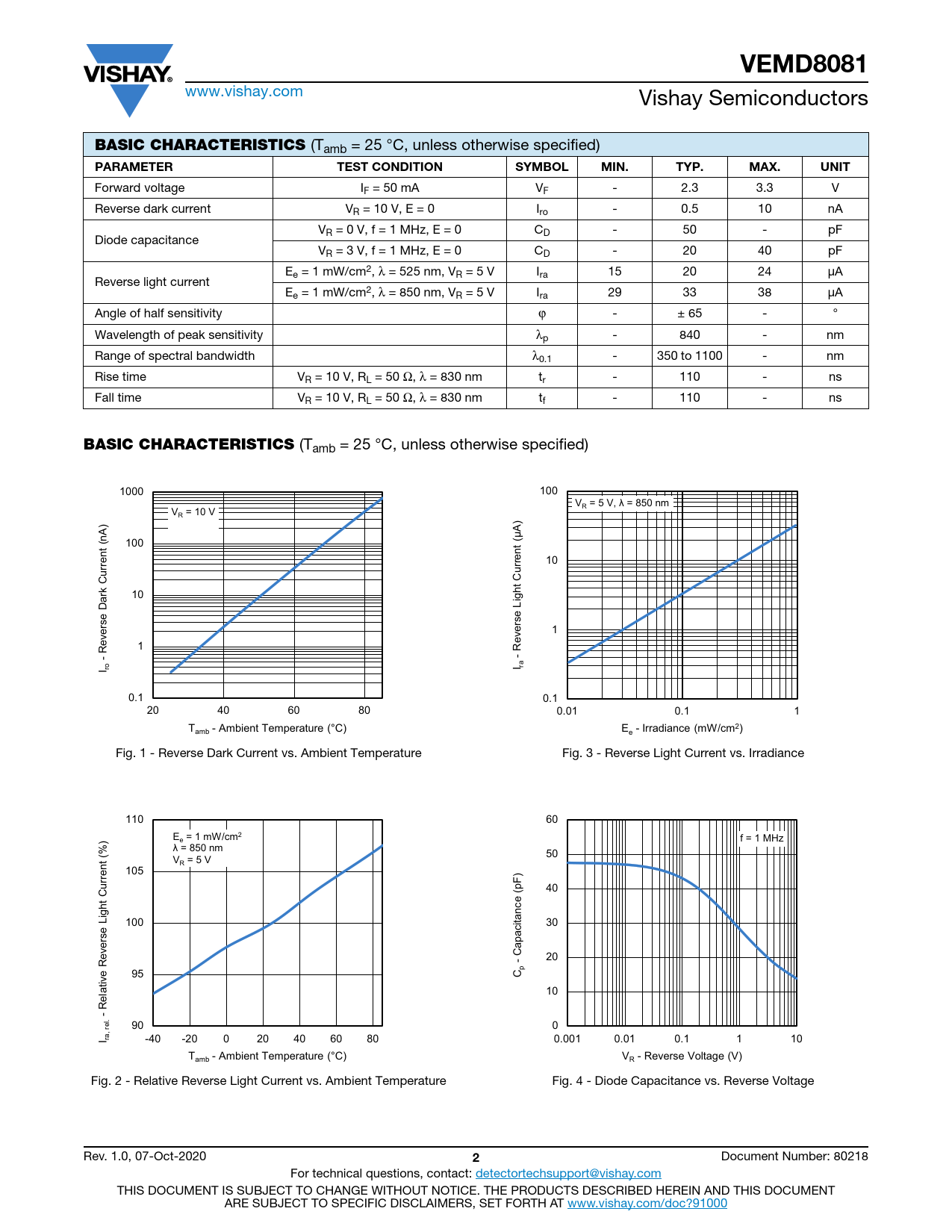 VEMD8081. BASIC CHARACTERISTICS. PARAMETER. TEST CONDITION. SYMBOL. MIN. TYP. MAX. UNIT
