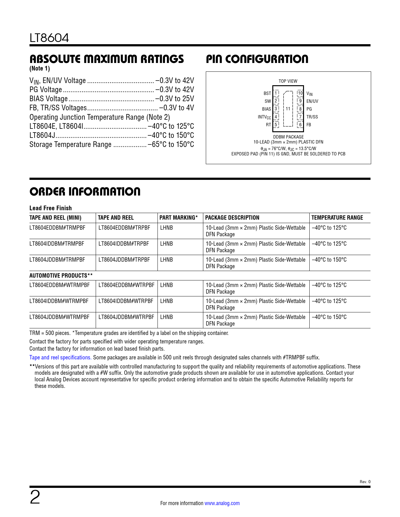 LT8604EDDBM#TRMPBF LT8604EDDBM#TRPBF LHNB 10-Lead (3mm × 2mm) Plastic Side-Wettable –40°C to 125°C DFN Package LT8604IDDBM#TRMPBF LT8604IDDBM#TRPBF LHNB 10-Lead (3mm × 2mm) Plastic Side-Wettable –40°C to 125°C DFN Package LT8604JDDBM#TRMPBF LT8604JDDBM#TRPBF LHNB 10-Lead (3mm × 2mm) Plastic Side-Wettable –40°C to 150°C DFN Package