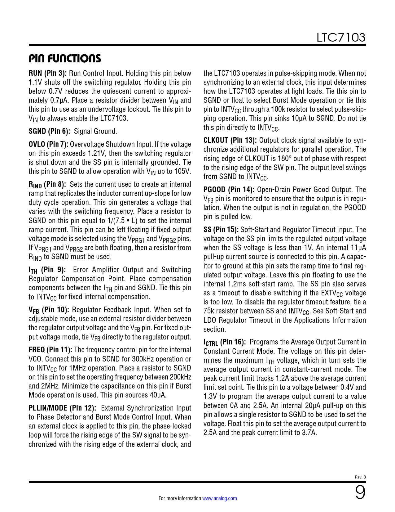 link to page 18 LTC7103 PIN FUNCTIONS RUN (Pin 3): Run Control Input. Holding this pin below the LTC7103 operates in pulse-skipping mode. When not 1.1V shuts off the switching regulator. Holding this pin synchronizing to an external clock, this input determines below 0.7V reduces the quiescent current to approxi- how the LTC7103 operates at light loads. Tie this pin to mately 0.7µA. Place a resistor divider between VIN and SGND or float to select Burst Mode operation or tie this this pin to use as an undervoltage lockout. Tie this pin to pin to INTVCC through a 100k resistor to select pulse-skip- VIN to always enable the LTC7103. ping operation. This pin sinks 10µA to SGND. Do not tie SGND (Pin 6): Signal Ground. this pin directly to INTVCC. OVLO (Pin 7): Overvoltage Shutdown Input. If the voltage CLKOUT (Pin 13): Output clock signal available to syn- on this pin exceeds 1.21V, then the switching regulator chronize additional regulators for parallel operation. The is shut down and the SS pin is internally grounded. Tie rising edge of CLKOUT is 180° out of phase with respect this pin to SGND to allow operation with V to the rising edge of the SW pin. The output level swings IN up to 105V. from SGND to INTVCC. RIND (Pin 8): Sets the current used to create an internal ramp that replicates the inductor current up-slope for low PGOOD (Pin 14): Open-Drain Power Good Output. The duty cycle operation. This pin generates a voltage that VFB pin is monitored to ensure that the output is in regu- varies with the switching frequency. Place a resistor to lation. When the output is not in regulation, the PGOOD SGND on this pin equal to 1/(7.5 • L) to set the internal pin is pulled low. ramp current. This pin can be left floating if fixed output SS (Pin 15): Soft-Start and Regulator Timeout Input. The voltage mode is selected using the VPRG1 and VPRG2 pins. voltage on the SS pin limits the regulated output voltage If VPRG1 and VPRG2 are both floating, then a resistor from when the SS voltage is less than 1V. An internal 11μA RIND to SGND must be used. pull-up current source is connected to this pin. A capac- I itor to ground at this pin sets the ramp time to final reg- TH (Pin 9): Error Amplifier Output and Switching Regulator Compensation Point. Place compensation ulated output voltage. Leave this pin floating to use the components between the I internal 1.2ms soft-start ramp. The SS pin also serves TH pin and SGND. Tie this pin to INTV as a timeout to disable switching if the EXTVCC voltage CC for fixed internal compensation. is too low. To disable the regulator timeout feature, tie a VFB (Pin 10): Regulator Feedback Input. When set to 75k resistor between SS and INTVCC. See Soft-Start and adjustable mode, use an external resistor divider between LDO Regulator Timeout in the Applications Information the regulator output voltage and the VFB pin. For fixed out- section. put voltage mode, tie VFB directly to the regulator output. ICTRL (Pin 16): Programs the Average Output Current in FREQ (Pin 11): The frequency control pin for the internal Constant Current Mode. The voltage on this pin deter- VCO. Connect this pin to SGND for 300kHz operation or mines the maximum ITH voltage, which in turn sets the to INTVCC for 1MHz operation. Place a resistor to SGND average output current in constant-current mode. The on this pin to set the operating frequency between 200kHz peak current limit tracks 1.2A above the average current and 2MHz. Minimize the capacitance on this pin if Burst limit set point. Tie this pin to a voltage between 0.4V and Mode operation is used. This pin sources 40µA. 1.3V to program the average output current to a value PLLIN/MODE (Pin 12): External Synchronization Input between 0A and 2.5A. An internal 20μA pull-up on this to Phase Detector and Burst Mode Control Input. When pin allows a single resistor to SGND to be used to set the an external clock is applied to this pin, the phase-locked voltage. Float this pin to set the average output current to loop will force the rising edge of the SW signal to be syn- 2.5A and the peak current limit to 3.7A. chronized with the rising edge of the external clock, and Rev. B For more information www.analog.com 9 Document Outline Features Applications Typical Application Description Absolute Maximum Ratings Order Information Pin Configuration Electrical Characteristics Typical Performance Characteristics Pin Functions Functional Diagram Operation Applications Information Package Description Revision History Typical Application Related Parts