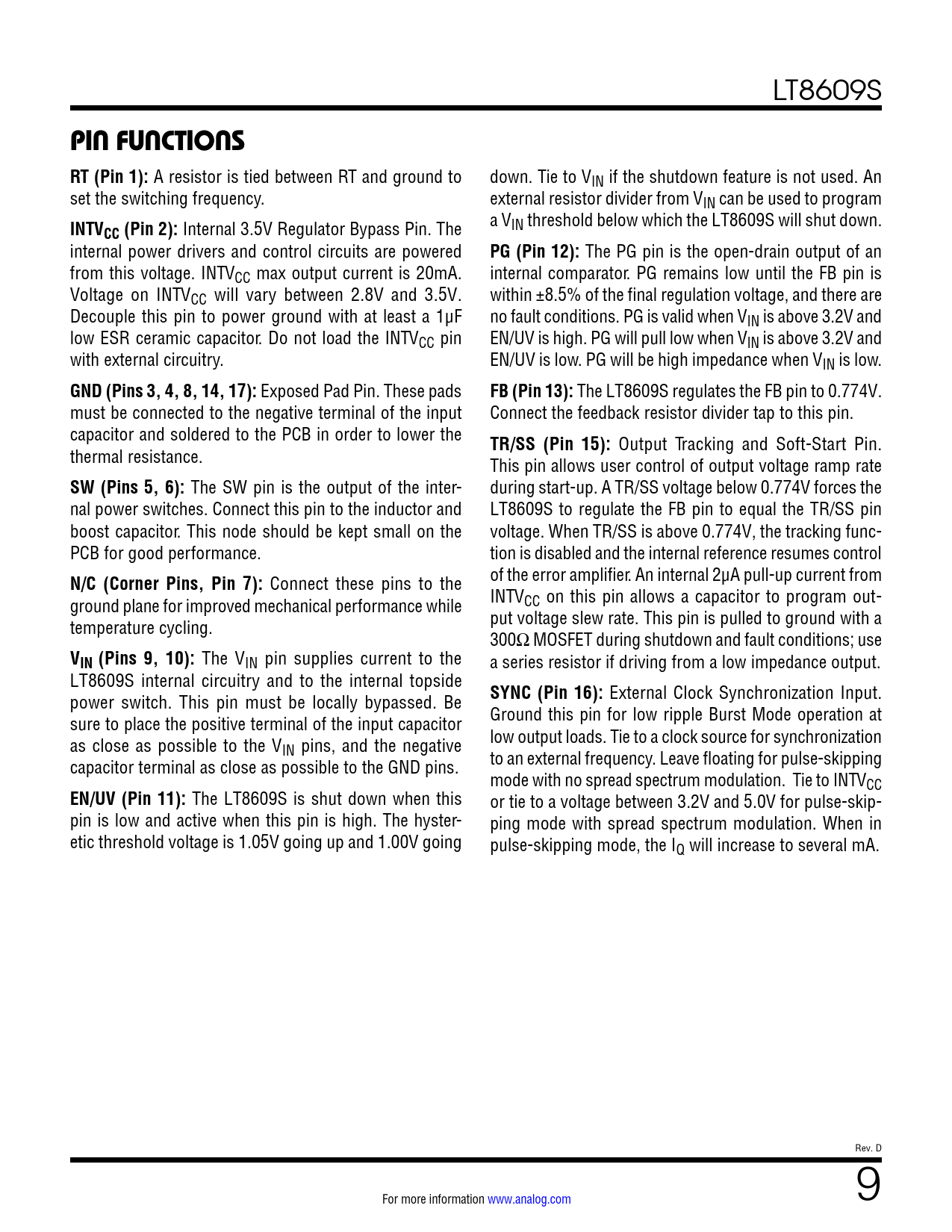 PIN FUNCTIONS RT (Pin 1):. INTV. CC (Pin 2):. PG (Pin 12):. GND (Pins 3, 4, 8, 14, 17):. FB (Pin 13):. TR/SS (Pin 15):