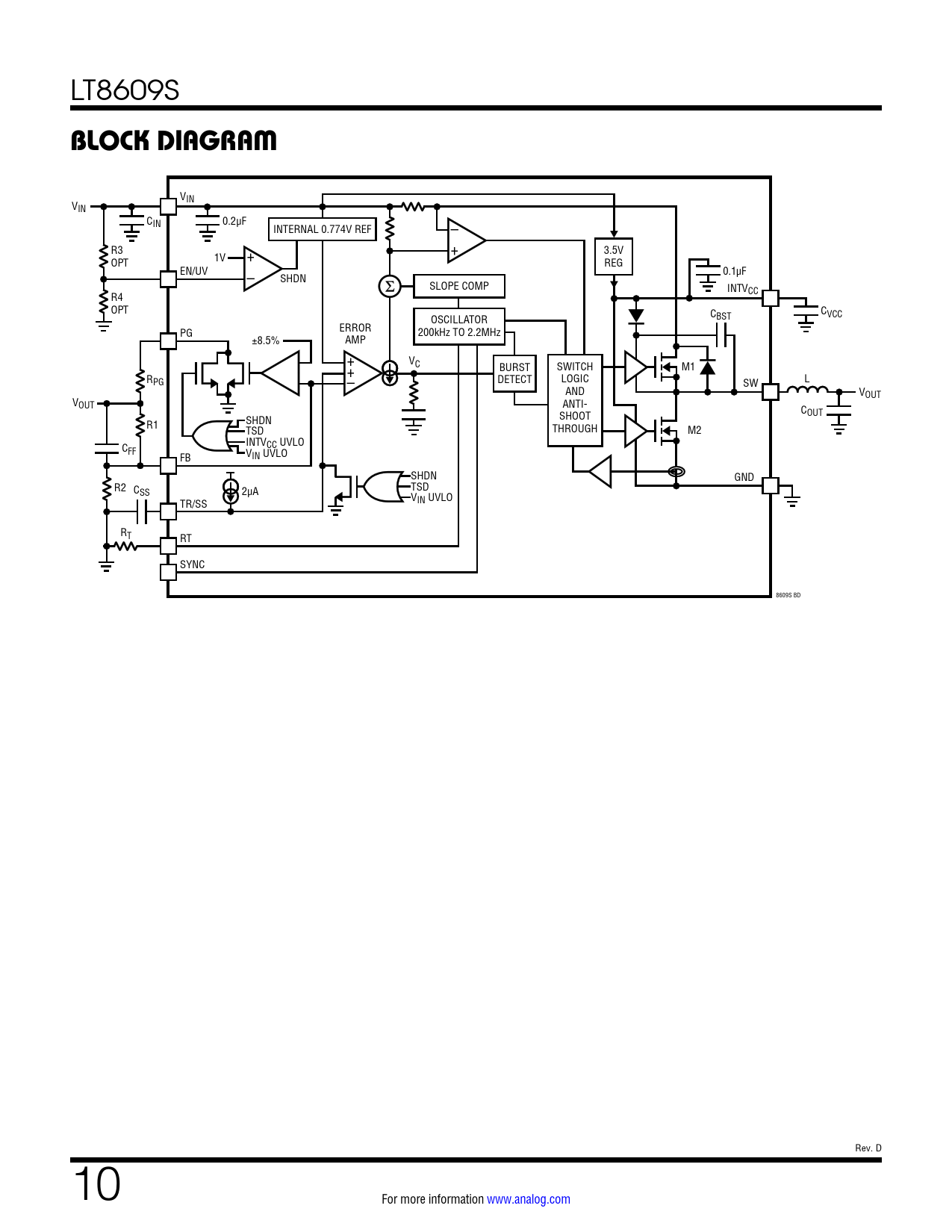 VIN VIN CIN 0.2µF – INTERNAL 0.774V REF + R3 3.5V 1V + OPT REG EN/UV – 0.1µF SHDN SLOPE COMP INTVCC R4 OPT C OSCILLATOR CBST VCC ERROR PG 200kHz TO 2.2MHz ±8.5% AMP + V + C BURST SWITCH M1 RPG – DETECT LOGIC SW L AND VOUT VOUT ANTI- COUT SHOOT R1 SHDN TSD THROUGH M2 C INTVCC UVLO FF VIN UVLO FB SHDN GND R2 C TSD SS 2µA VIN UVLO TR/SS RT RT SYNC 8609S BD Rev. D 10 For more information www.analog.com Document Outline Features Applications Typical Application Description Absolute Maximum Ratings Order Information Pin Configuration Electrical Characteristics Typical Performance Characteristics Pin Functions Block Diagram Operation Applications Information Typical Applications Package Description Revision History Typical Application Related Parts