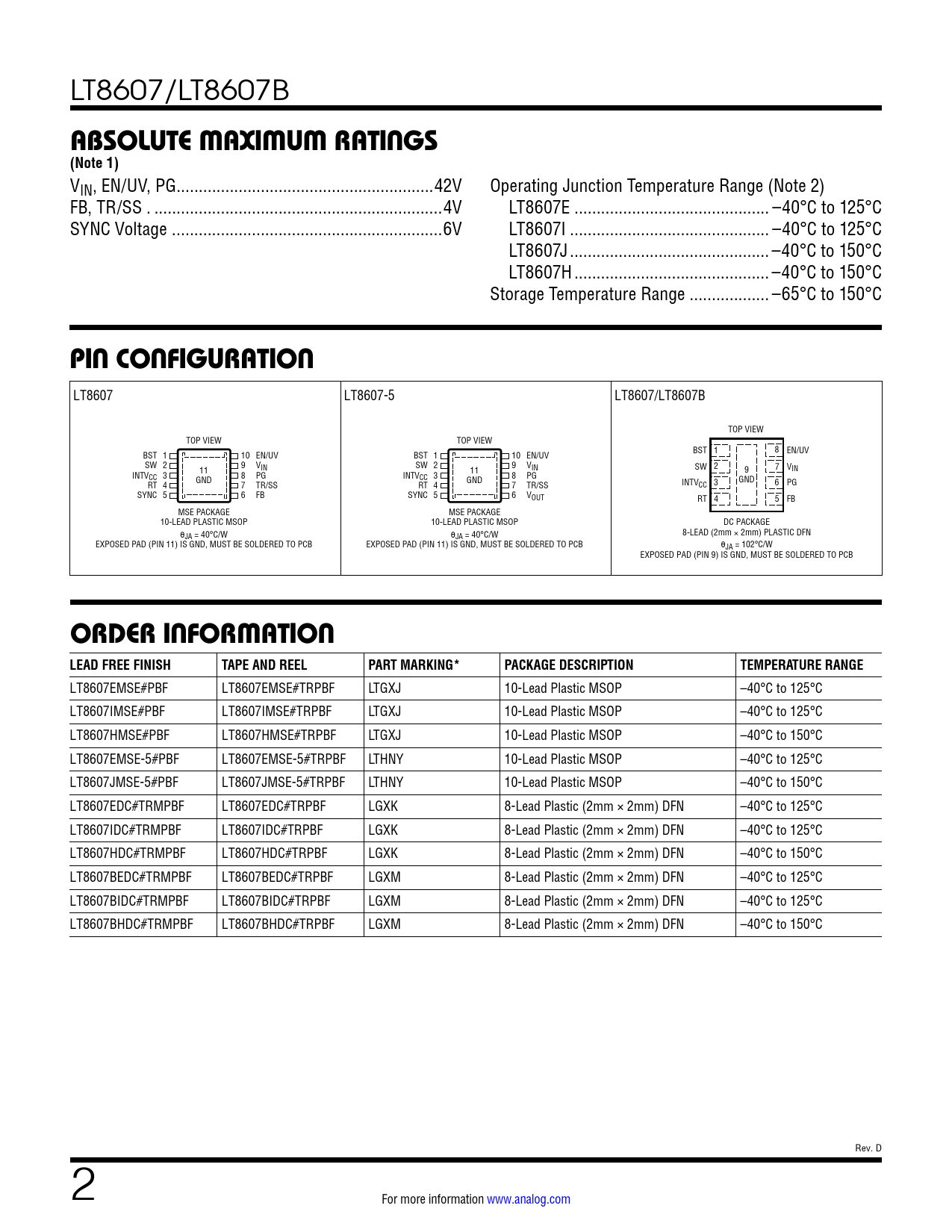 LT8607EMSE#PBF LT8607EMSE#TRPBF LTGXJ 10-Lead Plastic MSOP –40°C to 125°C LT8607IMSE#PBF LT8607IMSE#TRPBF LTGXJ 10-Lead Plastic MSOP –40°C to 125°C LT8607HMSE#PBF LT8607HMSE#TRPBF LTGXJ 10-Lead Plastic MSOP –40°C to 150°C LT8607EMSE-5#PBF LT8607EMSE-5#TRPBF LTHNY 10-Lead Plastic MSOP –40°C to 125°C LT8607JMSE-5#PBF LT8607JMSE-5#TRPBF LTHNY 10-Lead Plastic MSOP –40°C to 150°C LT8607EDC#TRMPBF LT8607EDC#TRPBF LGXK 8-Lead Plastic (2mm × 2mm) DFN –40°C to 125°C LT8607IDC#TRMPBF LT8607IDC#TRPBF LGXK 8-Lead Plastic (2mm × 2mm) DFN –40°C to 125°C LT8607HDC#TRMPBF LT8607HDC#TRPBF LGXK 8-Lead Plastic (2mm × 2mm) DFN –40°C to 150°C LT8607BEDC#TRMPBF LT8607BEDC#TRPBF LGXM 8-Lead Plastic (2mm × 2mm) DFN –40°C to 125°C LT8607BIDC#TRMPBF LT8607BIDC#TRPBF LGXM 8-Lead Plastic (2mm × 2mm) DFN –40°C to 125°C LT8607BHDC#TRMPBF LT8607BHDC#TRPBF LGXM 8-Lead Plastic (2mm × 2mm) DFN –40°C to 150°C Rev. D 2 For more information www.analog.com Document Outline Features Applications Typical Application Description Absolute Maximum Ratings Order Information Electrical Characteristics Electrical Characteristics Typical Performance Characteristics Pin Functions Block Diagram Operation Applications Information Typical Applications Package Description Revision History Typical Application Related Parts