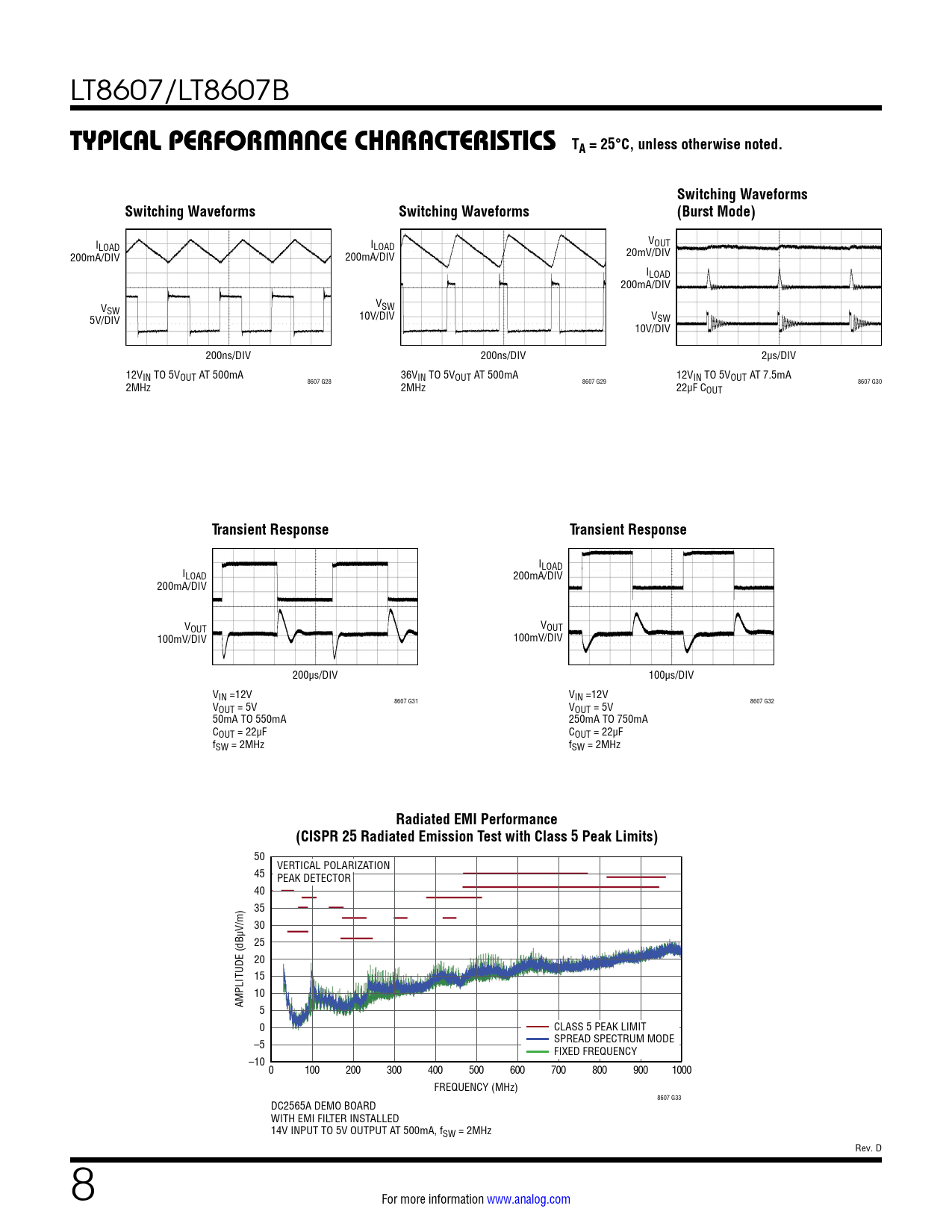 50 VERTICAL POLARIZATION 45 PEAK DETECTOR 40 35 V/m) 30 25 20 15 10 AMPLITUDE (dBµ 5 0 CLASS 5 PEAK LIMIT –5 SPREAD SPECTRUM MODE FIXED FREQUENCY –10 0 100 200 300 400 500 600 700 800 900 1000 FREQUENCY (MHz) 8607 G33 DC2565A DEMO BOARD WITH EMI FILTER INSTALLED 14V INPUT TO 5V OUTPUT AT 500mA, fSW = 2MHz Rev. D 8 For more information www.analog.com Document Outline Features Applications Typical Application Description Absolute Maximum Ratings Order Information Electrical Characteristics Electrical Characteristics Typical Performance Characteristics Pin Functions Block Diagram Operation Applications Information Typical Applications Package Description Revision History Typical Application Related Parts