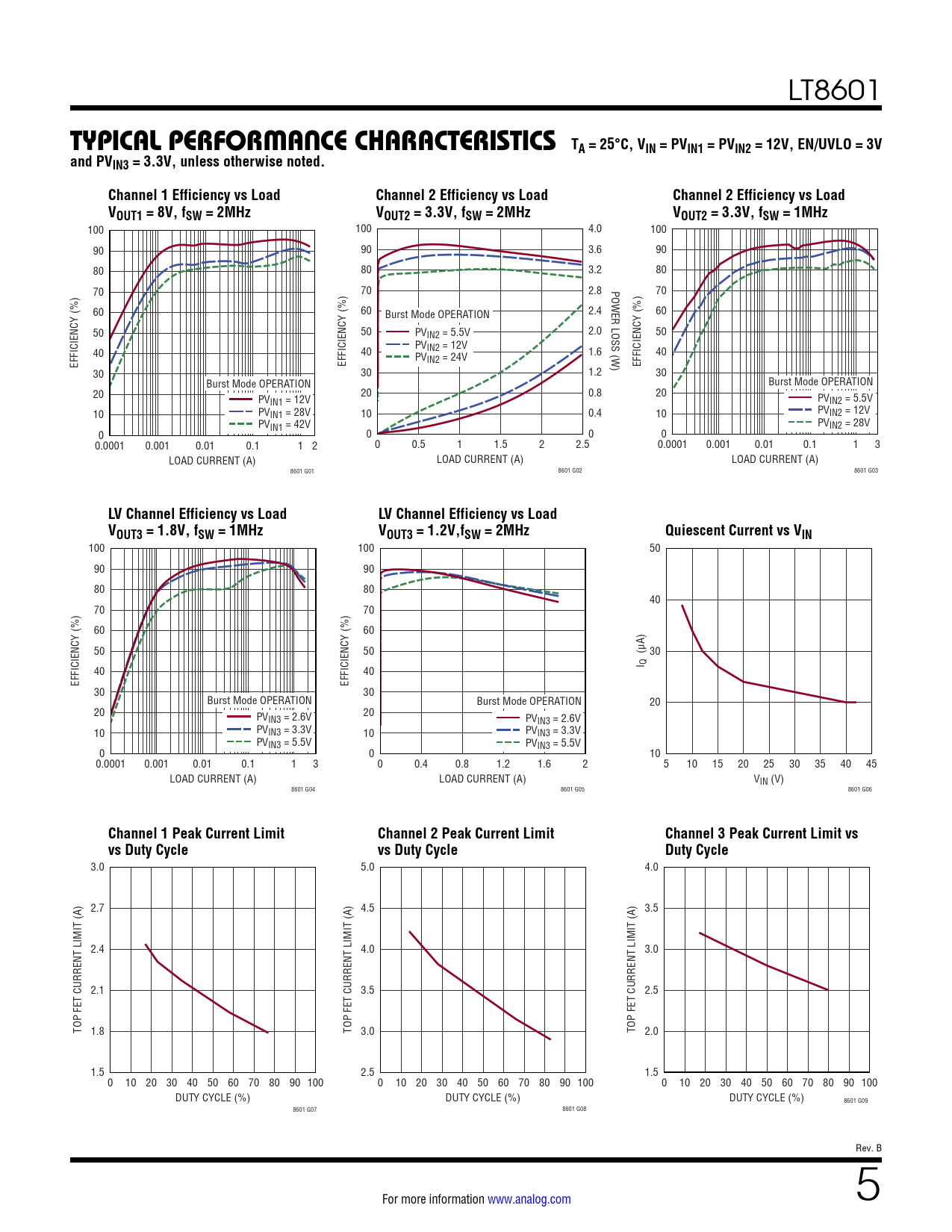 100 100 4.0 100 90 90 3.6 90 80 80 3.2 80 70 70 2.8 POWER LOSS (W) 70 60 60 2.4 Burst Mode OPERATION 60 50 50 PVIN2 = 5.5V 2.0 50 PV 40 IN2 = 12V 40 PV 1.6 40 EFFICIENCY (%) IN2 = 24V EFFICIENCY (%) EFFICIENCY (%) 30 30 1.2 30 Burst Mode OPERATION Burst Mode OPERATION 20 0.8 PV 20 20 IN1 = 12V PVIN2 = 5.5V PV 10 IN1 = 28V 10 0.4 PV 10 IN2 = 12V PVIN1 = 42V PVIN2 = 28V 0 0 0 0 0.0001 0.001 0.01 0.1 1 2 0 0.5 1 1.5 2 2.5 0.0001 0.001 0.01 0.1 1 3 LOAD CURRENT (A) LOAD CURRENT (A) LOAD CURRENT (A) 8601 G01 8601 G02 8601 G03