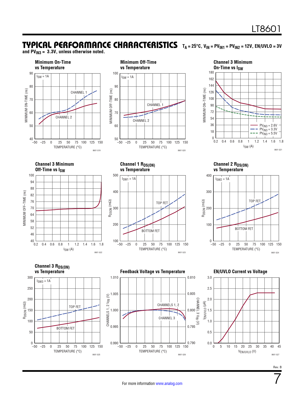 90 100 180 ISW = 1A ISW = 1A 162 80 90 144 CHANNEL 1 126 70 80 108 CHANNEL 1 90 60 70 72 CHANNEL 2 54 MINIMUM ON-TIME (ns) MINIMUM OFF-TIME (ns) CHANNEL 2 MINIMUM ON–TIME (ns) 50 60 36 PVIN3 = 2.6V PVIN3 = 3.3V 18 PVIN3 = 5.5V 40 50 0 –50 –25 0 25 50 75 100 125 150 –50 –25 0 25 50 75 100 125 150 0.2 0.4 0.6 0.8 1 1.2 1.4 1.6 1.8 TEMPERATURE (°C) TEMPERATURE (°C) ISW (A) 8601 G19 8601 G20 8601 G21