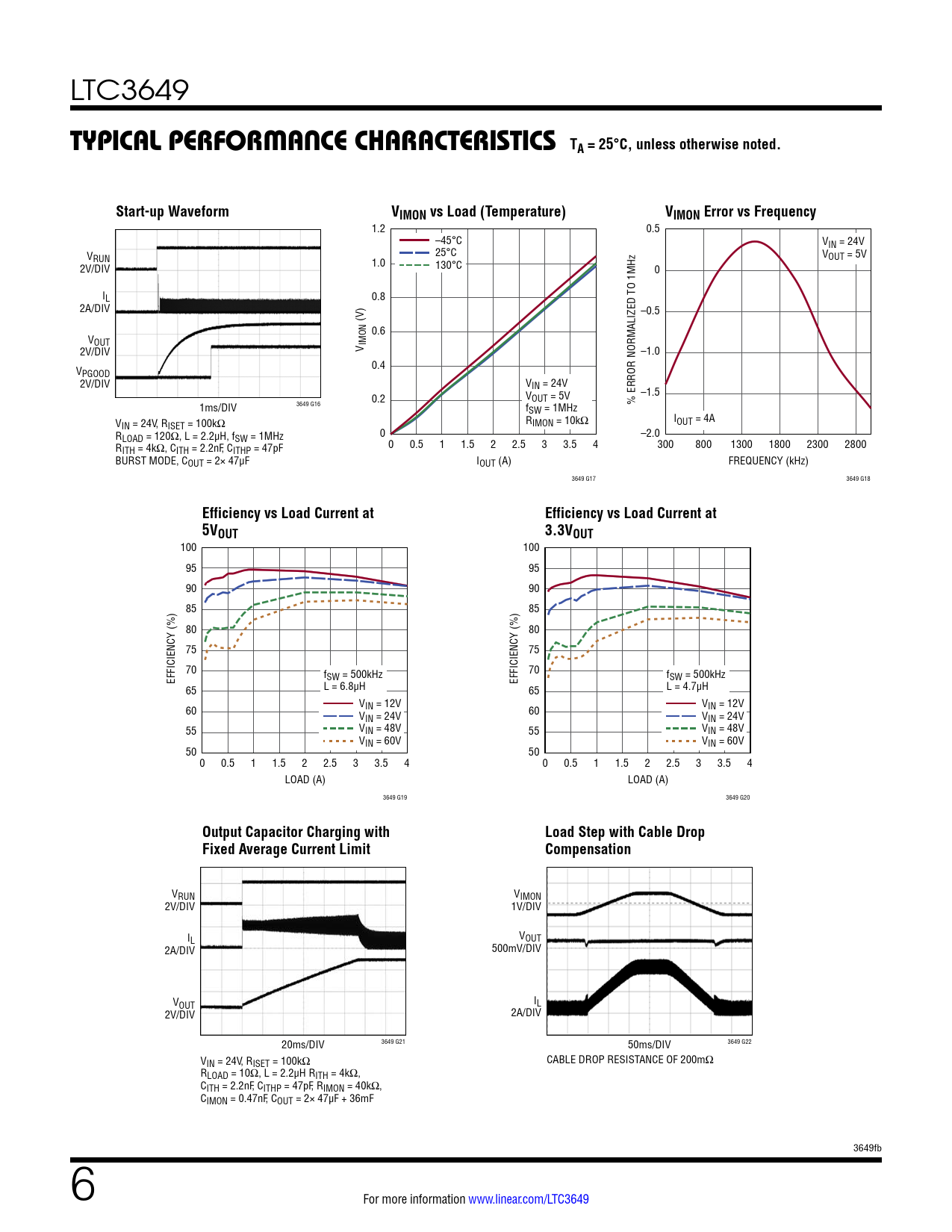 1.2 0.5 –45°C VIN = 24V V 25°C RUN VOUT = 5V 2V/DIV 1.0 130°C 0 IL 0.8 2A/DIV –0.5 (V) 0.6 VOUT 2V/DIV V IMON –1.0 V 0.4 PGOOD 2V/DIV VIN = 24V –1.5 0.2 VOUT = 5V 3649 G16 1ms/DIV % ERROR NORMALIZED TO 1MHz fSW = 1MHz V R I IN = 24V, RISET = 100kΩ IMON = 10kΩ OUT = 4A RLOAD = 120Ω, L = 2.2µH, fSW = 1MHz 0 –2.0 R 0 0.5 1 1.5 2 2.5 3 3.5 4 300 800 1300 1800 2300 2800 ITH = 4kΩ, CITH = 2.2nF, CITHP = 47pF BURST MODE, COUT = 2× 47µF IOUT (A) FREQUENCY (kHz) 3649 G17 3649 G18