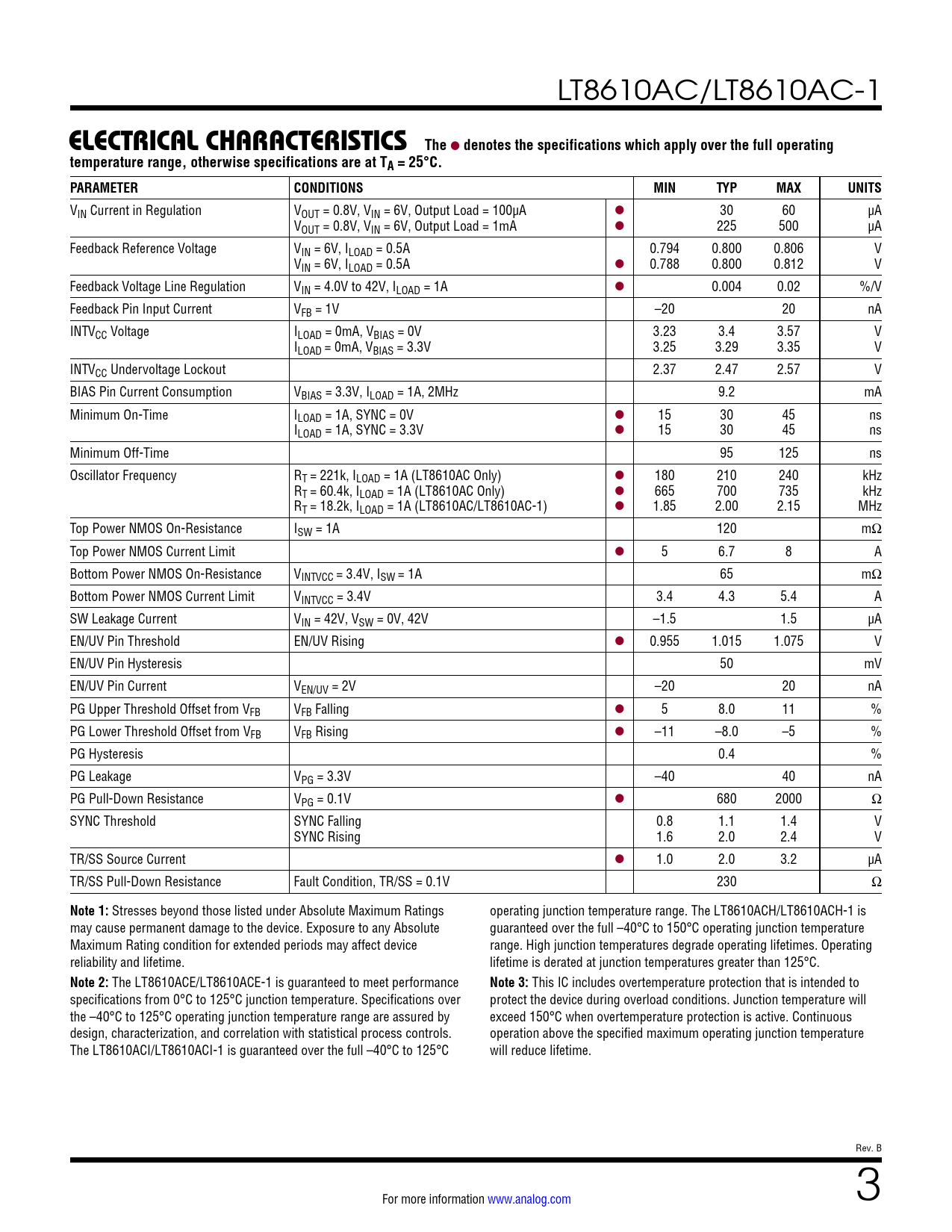 VIN Current in Regulation VOUT = 0.8V, VIN = 6V, Output Load = 100µA l 30 60 µA VOUT = 0.8V, VIN = 6V, Output Load = 1mA l 225 500 µA Feedback Reference Voltage VIN = 6V, ILOAD = 0.5A 0.794 0.800 0.806 V VIN = 6V, ILOAD = 0.5A l 0.788 0.800 0.812 V Feedback Voltage Line Regulation VIN = 4.0V to 42V, ILOAD = 1A l 0.004 0.02 %/V Feedback Pin Input Current VFB = 1V –20 20 nA INTVCC Voltage ILOAD = 0mA, VBIAS = 0V 3.23 3.4 3.57 V ILOAD = 0mA, VBIAS = 3.3V 3.25 3.29 3.35 V INTVCC Undervoltage Lockout 2.37 2.47 2.57 V BIAS Pin Current Consumption VBIAS = 3.3V, ILOAD = 1A, 2MHz 9.2 mA Minimum On-Time ILOAD = 1A, SYNC = 0V l 15 30 45 ns ILOAD = 1A, SYNC = 3.3V l 15 30 45 ns Minimum Off-Time 95 125 ns Oscillator Frequency RT = 221k, ILOAD = 1A (LT8610AC Only) l 180 210 240 kHz RT = 60.4k, ILOAD = 1A (LT8610AC Only) l 665 700 735 kHz RT = 18.2k, ILOAD = 1A (LT8610AC/LT8610AC-1) l 1.85 2.00 2.15 MHz Top Power NMOS On-Resistance ISW = 1A 120 mΩ Top Power NMOS Current Limit l 5 6.7 8 A Bottom Power NMOS On-Resistance VINTVCC = 3.4V, ISW = 1A 65 mΩ Bottom Power NMOS Current Limit VINTVCC = 3.4V 3.4 4.3 5.4 A SW Leakage Current VIN = 42V, VSW = 0V, 42V –1.5 1.5 µA EN/UV Pin Threshold EN/UV Rising l 0.955 1.015 1.075 V EN/UV Pin Hysteresis 50 mV EN/UV Pin Current VEN/UV = 2V –20 20 nA PG Upper Threshold Offset from VFB VFB Falling l 5 8.0 11 % PG Lower Threshold Offset from VFB VFB Rising l –11 –8.0 –5 % PG Hysteresis 0.4 % PG Leakage VPG = 3.3V –40 40 nA PG Pull-Down Resistance VPG = 0.1V l 680 2000 Ω SYNC Threshold SYNC Falling 0.8 1.1 1.4 V SYNC Rising 1.6 2.0 2.4 V TR/SS Source Current l 1.0 2.0 3.2 µA TR/SS Pull-Down Resistance Fault Condition, TR/SS = 0.1V 230 Ω