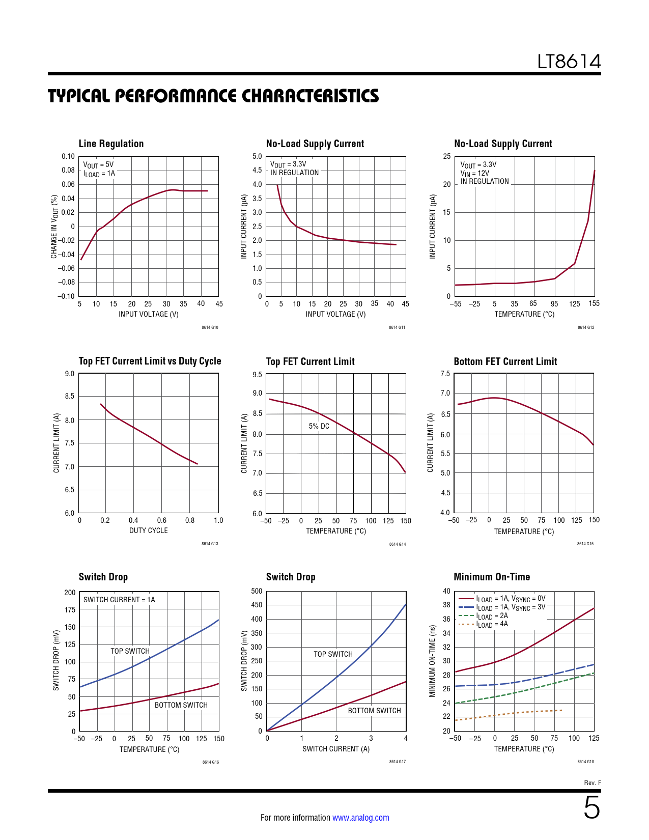 200 500 40 SWITCH CURRENT = 1A I 450 38 LOAD = 1A, VSYNC = 0V 175 ILOAD = 1A, VSYNC = 3V 400 36 ILOAD = 2A 150 ILOAD = 4A 350 34 125 TOP SWITCH 300 32 TOP SWITCH 100 250 30 75 200 28 SWITCH DROP (mV) SWITCH DROP (mV) 150 26 50 MINIMUM ON-TIME (ns) BOTTOM SWITCH 100 24 25 BOTTOM SWITCH 50 22 0 0 20 –50 –25 0 25 50 75 100 125 150 0 1 2 3 4 –50 –25 0 25 50 75 100 125 TEMPERATURE (°C) SWITCH CURRENT (A) TEMPERATURE (°C) 8614 G16 8614 G17 8614 G18 Rev. F For more information www.analog.com 5 Document Outline Features Applications Typical Application Description Absolute Maximum Ratings Order Information Electrical Characteristics Pin Configuration Electrical Characteristics Typical Performance Characteristics Pin Functions Block Diagram Operation Applications Information Package Description Revision History Typical Applications Related Parts