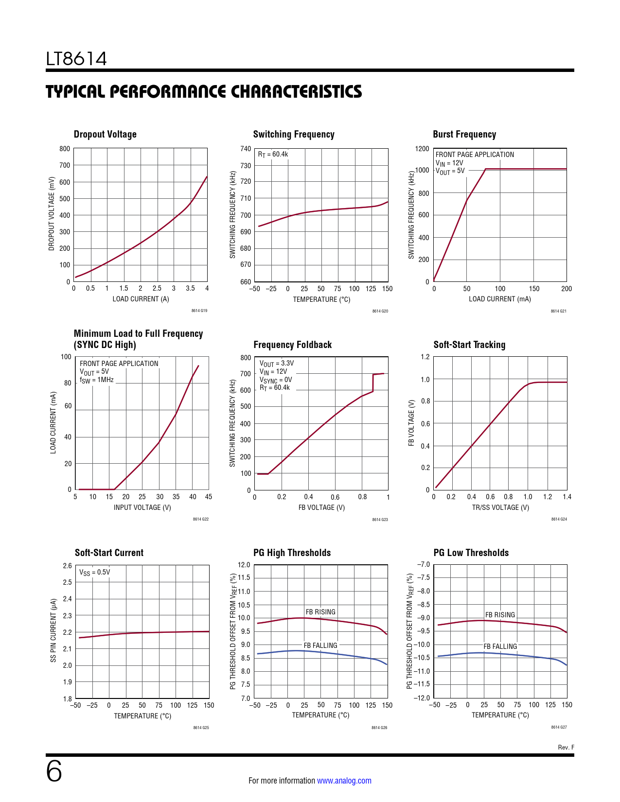 2.6 12.0 –7.0 VSS = 0.5V 11.5 –7.5 2.5 (%) (%) REF 11.0 REF –8.0 2.4 10.5 –8.5 2.3 FB RISING 10.0 –9.0 FB RISING 2.2 9.5 –9.5 –10.0 2.1 9.0 FB FALLING FB FALLING SS PIN CURRENT (µA) 8.5 –10.5 2.0 8.0 –11.0 1.9 PG THRESHOLD OFFSET FROM V 7.5 PG THRESHOLD OFFSET FROM V –11.5 1.8 7.0 –12.0 –50 –25 0 25 50 75 100 125 150 –50 –25 0 25 50 75 100 125 150 –50 –25 0 25 50 75 100 125 150 TEMPERATURE (°C) TEMPERATURE (°C) TEMPERATURE (°C) 8614 G25 8614 G26 8614 G27 Rev. F 6 For more information www.analog.com Document Outline Features Applications Typical Application Description Absolute Maximum Ratings Order Information Electrical Characteristics Pin Configuration Electrical Characteristics Typical Performance Characteristics Pin Functions Block Diagram Operation Applications Information Package Description Revision History Typical Applications Related Parts