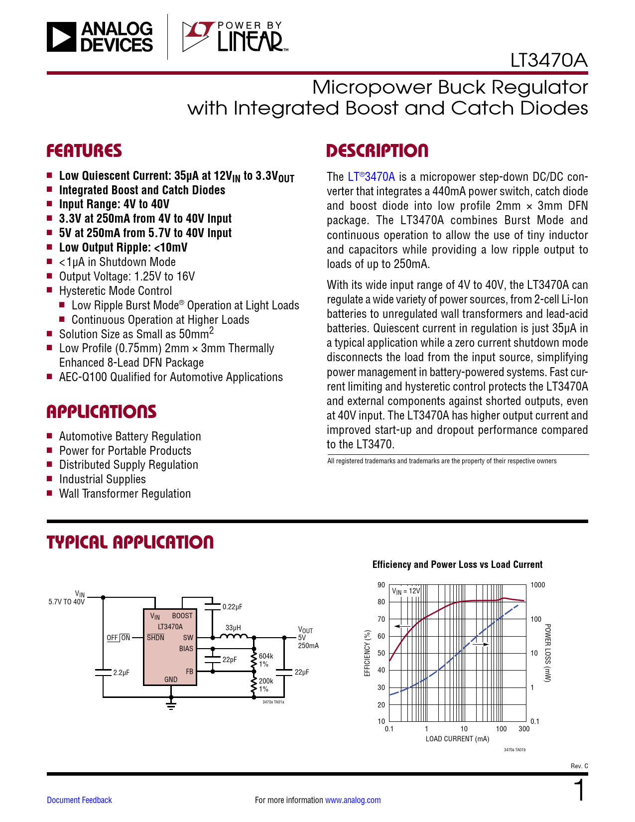 and external components against shorted outputs, even at 40V input. The LT3470A has higher output current and improved start-up and dropout performance compared n Automotive Battery Regulation n to the LT3470. Power for Portable Products All registered trademarks and trademarks are the property of their respective owners n Distributed Supply Regulation n Industrial Supplies n Wall Transformer Regulation