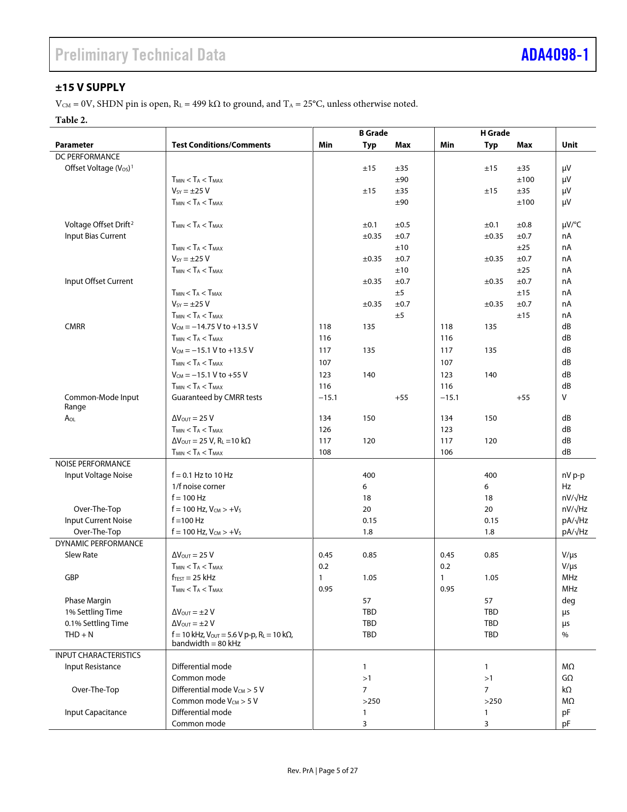 Preliminary Technical Data. ADA4098-1. ±15 V SUPPLY. Table 2. B Grade. H Grade. Parameter. Test Conditions/Comments. Min. Typ. Max. Unit
