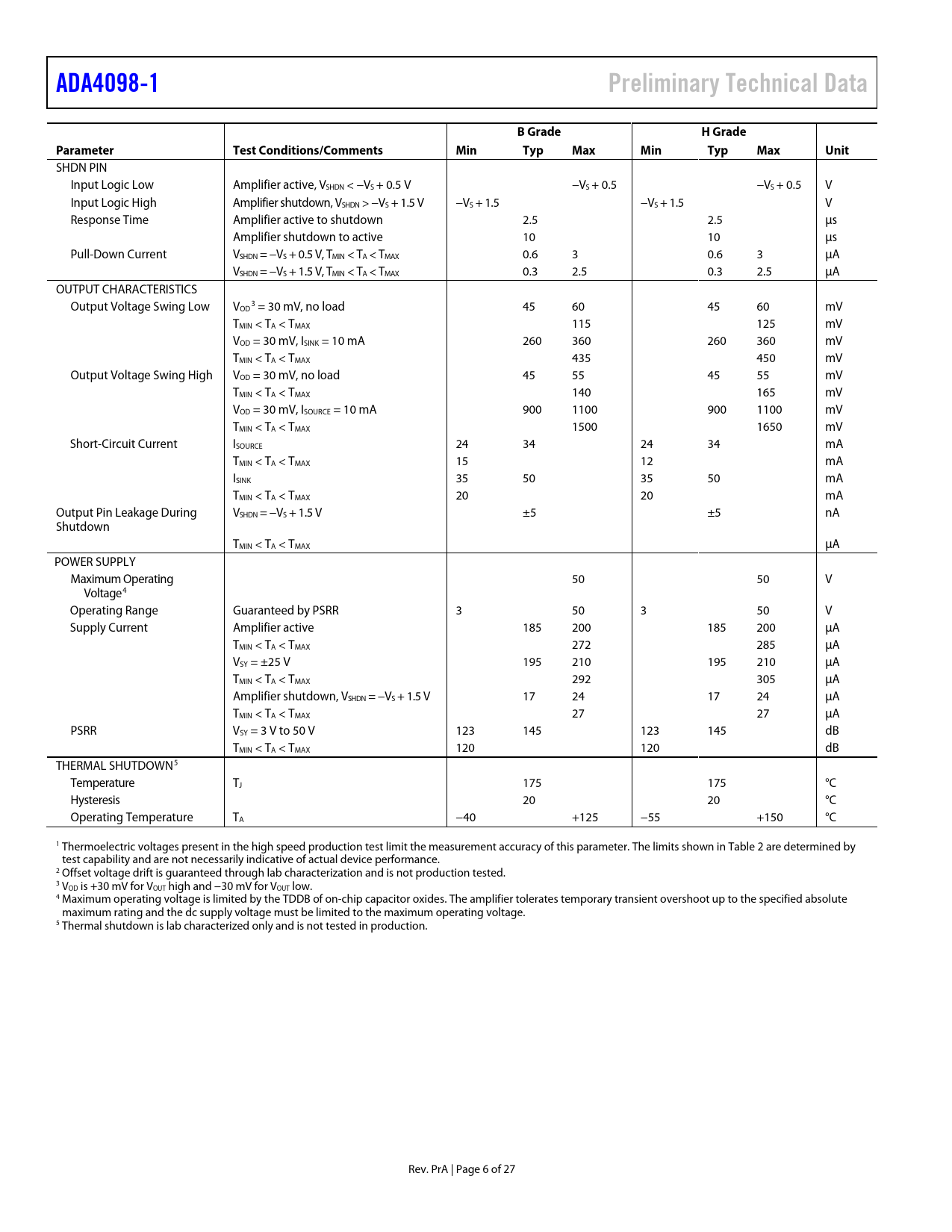 Páginas / Página27 / 6 — ADA4098-1. Preliminary Technical Data. B Grade. H Grade. Parameter. Test …