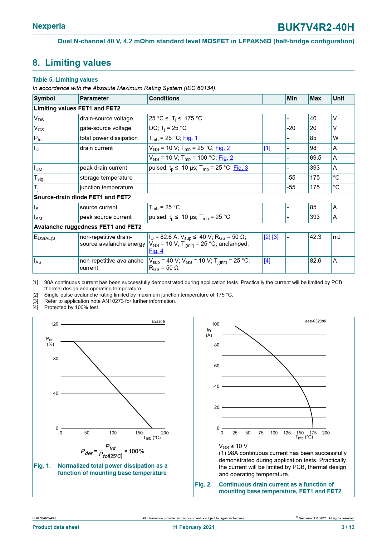 Nexperia BUK7V4R2-40H Dual N-channel 40 V, 4.2 mOhm standard level MOSFET in LFPAK56D (half-bridge configuration) 8. Limiting values Table 5. Limiting values