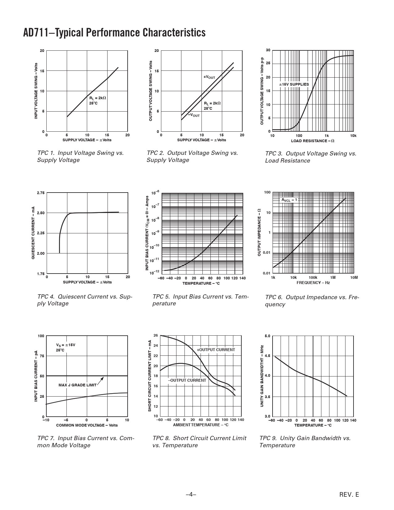 TPC 4. Quiescent Current vs. Sup- TPC 5. Input Bias Current vs. Tem- TPC 6. Output Impedance vs. Fre- ply Voltage perature quency