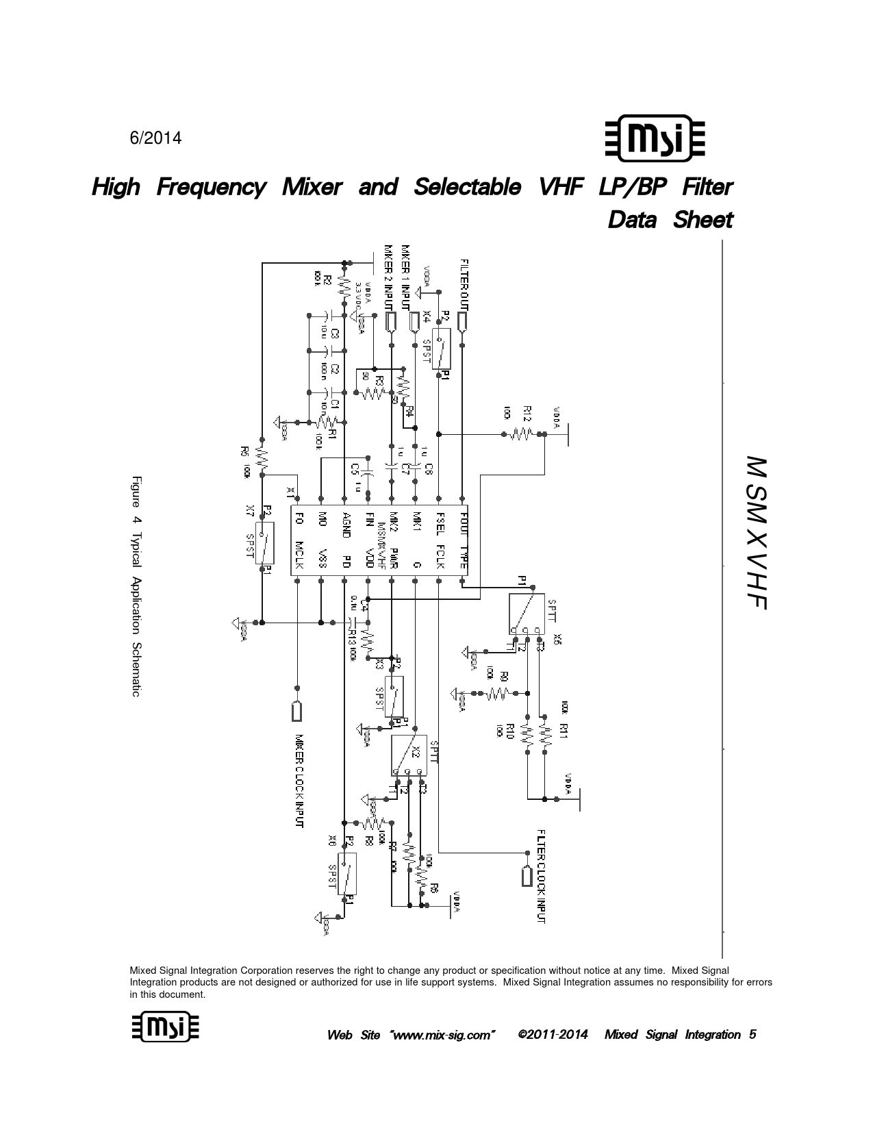 Figure 4 T ypical Application Schematic Mixed Signal Integration Corporation reserves the right to change any product or specification without notice at any time. Mixed Signal Integration products are not designed or authorized for use in life support systems. Mixed Signal Integration assumes no responsibility for errors in this document. Web Site “www.mix-ssig.com” ©2011-2 2014 Mixed Signal Integration 5